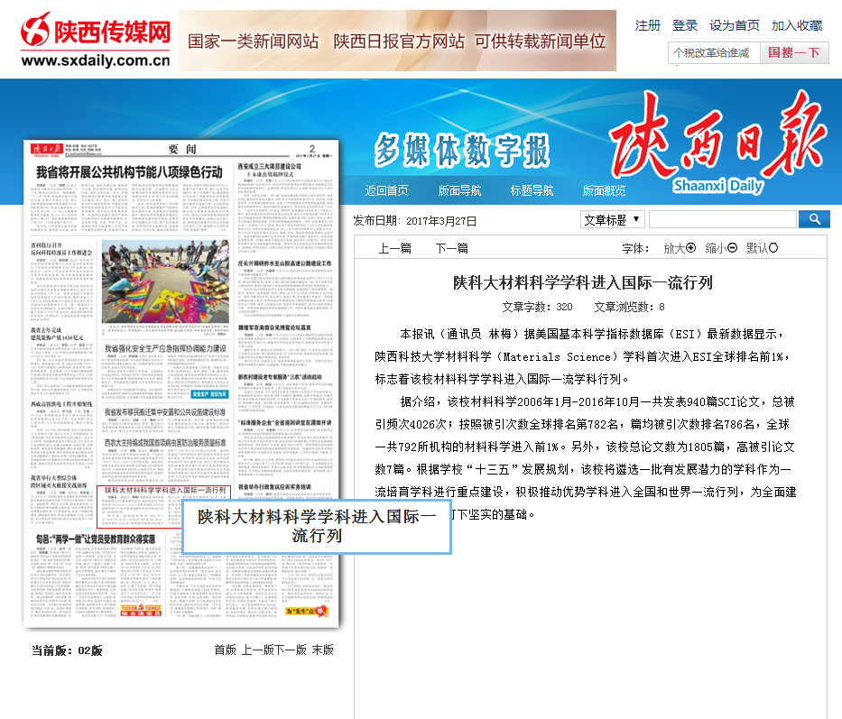 陜西日報3月27日在“要聞”版以《陜科大材料科學學科進入國際一流行列》為題,報道了我校材料科學學科首次進入ESI全球排名前1%的新聞,全文轉載如下: