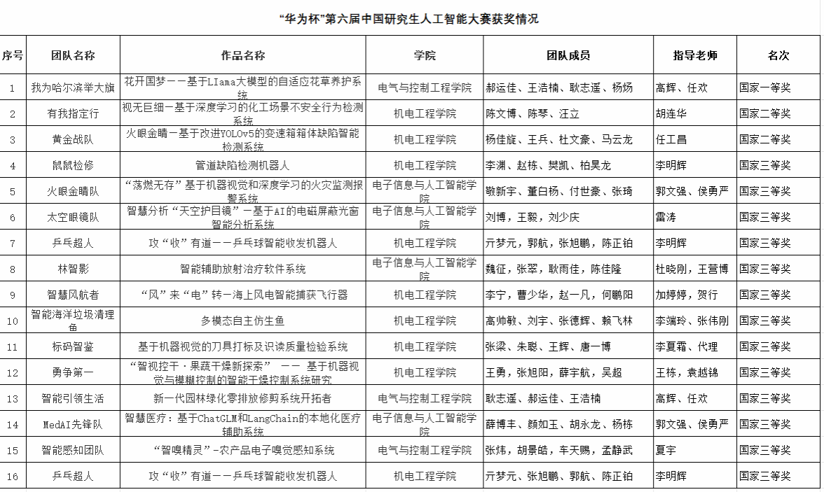 “華為杯”第六屆中國研究生人工智能創(chuàng)新大賽于2024年4月開賽,共有來自310個研究生培養(yǎng)單位的2618支隊伍報名參賽,其中2228支隊伍完成作品提交。經過初賽評審,共有200支隊伍晉級全國總決賽,586支隊伍獲三等獎。我?!拔覟楣枮I舉大旗”“有我指定行”“黃金戰(zhàn)隊”3支代表隊晉級全國總決賽。經過現場項目展示和答辯,“我為哈爾濱舉大旗”獲得哈爾濱賽題國賽一等獎,其余兩支隊伍獲國賽二等獎。自開賽以來,研究生院(黨委研究生工作部)大力宣傳、廣泛動員師生參賽,聯合機電工程學院(智能制造與機器人工程學院)共同組織校賽遴選和輔導。經過不斷的作品完善,我校斬獲16項國家獎項,獲獎成績取得新突破。