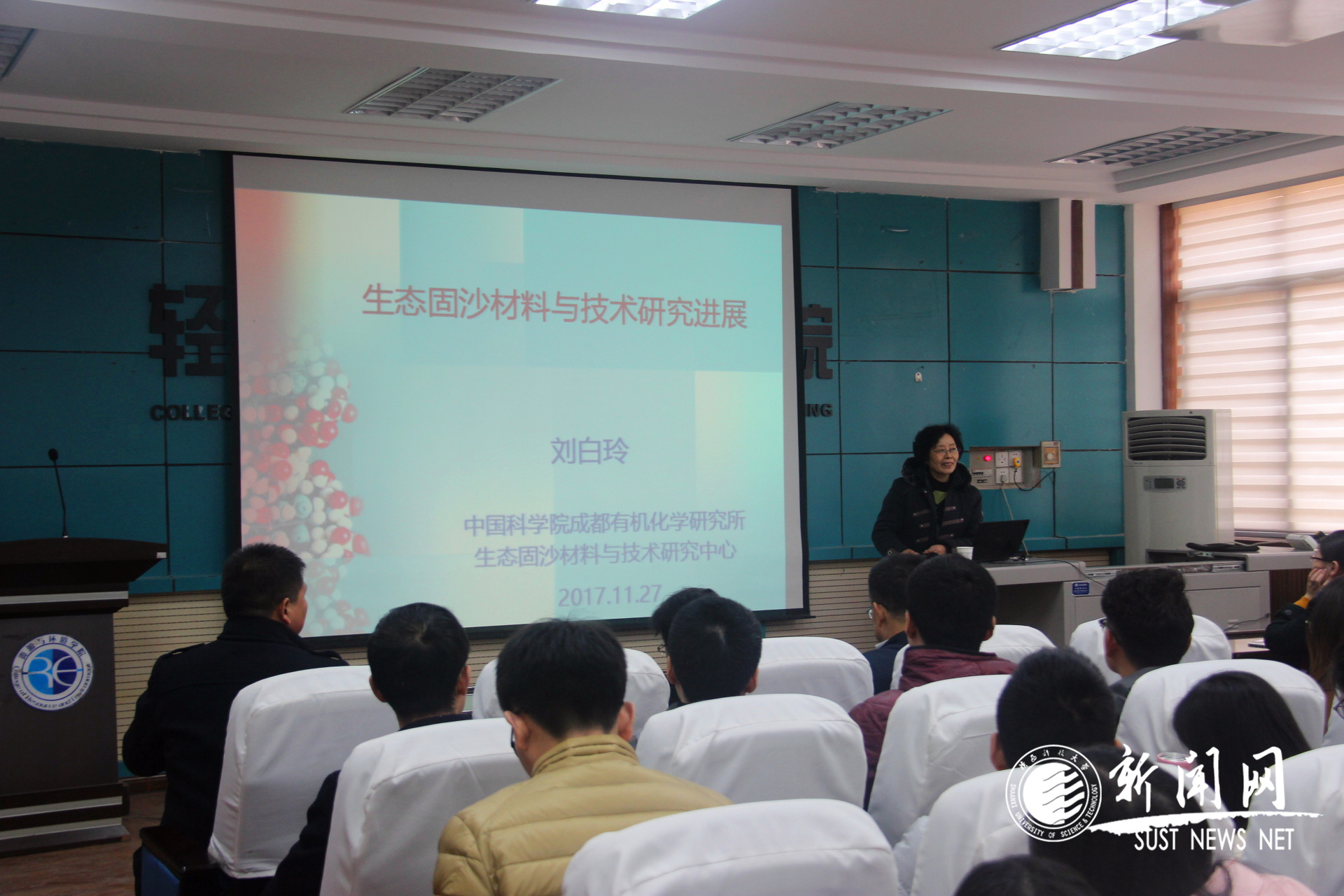 11月27日下午,中國科學(xué)院成都有機(jī)化學(xué)研究所劉白玲教授作客我?!拔囱雽?dǎo)師論壇”,在輕工學(xué)院學(xué)術(shù)報(bào)告廳為學(xué)院師生作了題為《生態(tài)固沙材料與技術(shù)研究進(jìn)展》和《談?wù)勓芯可墓ぷ鳌返膶W(xué)術(shù)報(bào)告會(huì)。校長馬建中教授、研究生院副院長以及輕工學(xué)院相關(guān)負(fù)責(zé)人參會(huì)。報(bào)告會(huì)由輕工學(xué)院副院長呂斌主持,學(xué)院部分教師和碩博士研究生參加了此次報(bào)告會(huì)。