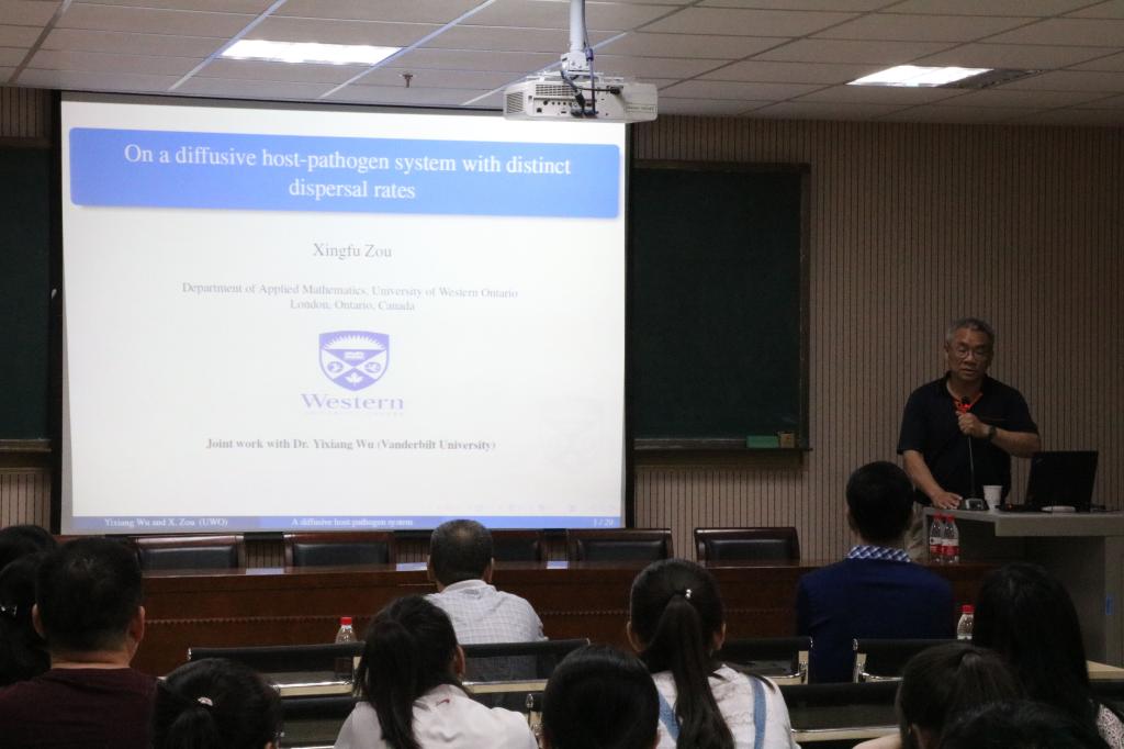 6月12號,來自加拿大西安大略大學(University of Western Ontario)的博士生導師鄒幸福教授應邀來校做了“具有不同分散速率和空間異質性的一類反應擴散宿主--病原體系統(tǒng)的研究”學術報告。報告由文理學院院長藺小林教授主持,參加學術報告的有文理學院數學系中青年教師、碩士研究生導師、研究生、以及本科生等。