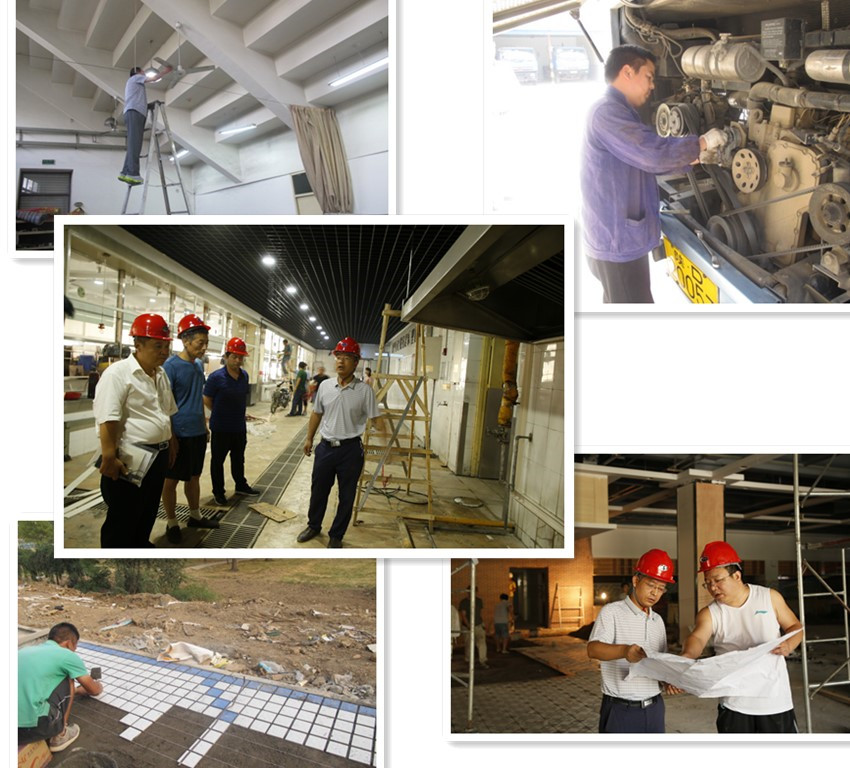 在沁園餐廳暖氣管道改造的工程現(xiàn)場,伴隨“嗞嗞”聲響,火花四濺,白煙彌漫,腳手架上的電焊工們正在進行著一系統(tǒng)暖氣支管和三系統(tǒng)主管道的焊接改造。后勤集團工程維修中心技術(shù)總監(jiān)王笑菲來回巡視著現(xiàn)場,薄薄的T恤衫已經(jīng)滲出了汗水。盡管才是上午9點多,可他們開工已經(jīng)有兩個小時了。該工程要將一二餐廳中鋪設(shè)在地溝中的采暖供回水系統(tǒng)全部改造為頂部運行,其氣密性、壓力要求高,加之現(xiàn)場施工條件復(fù)雜,8月底完工的時限不可謂壓力不大?!拔覀兠刻煸缟?點開工,晚上7點收工,一刻都不敢耽誤。光是設(shè)計施工圖紙一項,設(shè)計院的最初方案只有2張,我們根據(jù)現(xiàn)場實際需要重新修改設(shè)計就做了11張?!蓖跣Ψ普f。包括這項最大的工程在內(nèi),后勤集團暑期內(nèi)共安排了49項維修改造項目,涉及教學(xué)樓、實驗樓、圖書館、餐廳、浴室、配電室、車管中心等服務(wù)設(shè)施設(shè)備集中的所在。為確保進度和質(zhì)量,后勤集團不僅明確了各項任務(wù)的時間表,而且嚴格規(guī)范過程管理,每個項目均加強前期論證,確定現(xiàn)場負責(zé)人員,引入工程監(jiān)理?!笆罴僖詠砗笄谠S多職工奮戰(zhàn)在一線,為的就是新學(xué)期開學(xué)時,能夠給全校師生帶來一個煥然一新的校園面貌和服務(wù)體驗?!焙笄诩瘓F總經(jīng)理周文濤堅定地說。