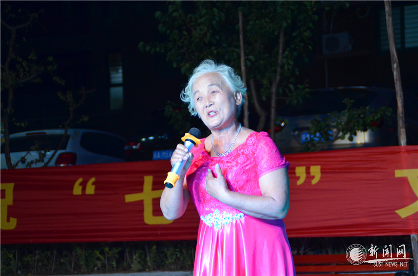 晚會(huì)節(jié)目豐富多彩,有合唱、獨(dú)唱、器樂(lè)獨(dú)奏、舞蹈,詩(shī)朗誦等。73歲高齡的晁哲老師,滿頭銀發(fā)一身紅裝,一曲《黨啊,親愛(ài)的媽媽》洪亮的歌聲引發(fā)全場(chǎng)共鳴。丁寶玲、朱志華演奏的民族器樂(lè)葫蘆絲,悅耳動(dòng)聽(tīng),悠揚(yáng)自然,仿佛引領(lǐng)大家到了云霞霧繞,煙雨濛濛的苗家山寨。一曲曲深情的旋律,在耳畔飄縈;一首首嘹亮的歌聲,在沁園小區(qū)回蕩;一句句誠(chéng)摯的話語(yǔ),在觀眾心中澎湃。