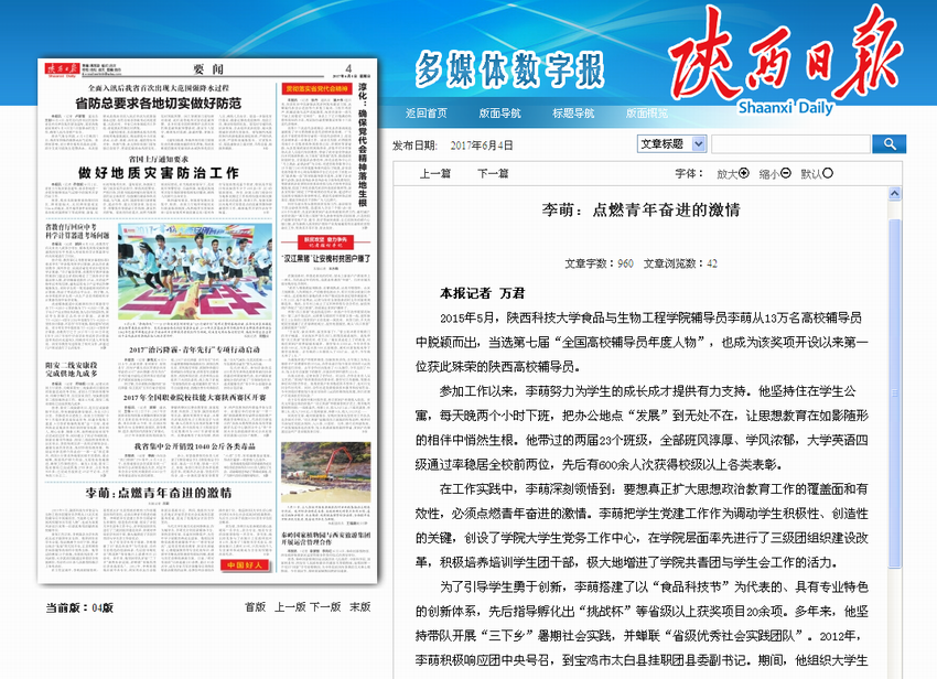 2015年5月,陜西科技大學(xué)食品與生物工程學(xué)院輔導(dǎo)員李萌從13萬名高校輔導(dǎo)員中脫穎而出,當(dāng)選第七屆“全國高校輔導(dǎo)員年度人物”,也成為該獎項(xiàng)開設(shè)以來第一位獲此殊榮的陜西高校輔導(dǎo)員。