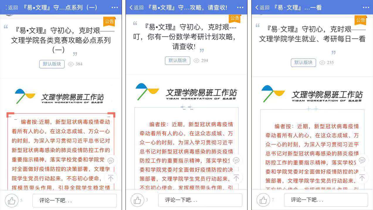 在政策宣傳方面,教育學(xué)院黨務(wù)工作中心帶領(lǐng)全體黨員積極籌劃、群策群力,對學(xué)院學(xué)生黨建官微后臺進(jìn)行改版,新增了疫情動態(tài)(實(shí)時狀況、疫情解疑、直擊現(xiàn)場)、辟謠科普(辟謠科普、個人防護(hù))及馳援武漢(我為武漢加油)欄目,宣傳黨的政策方針。在學(xué)業(yè)幫扶方面,成立了教育學(xué)院學(xué)業(yè)幫扶黨員工作小組,學(xué)生黨員對全院學(xué)生掛科情況進(jìn)行了摸排,并對接班委對學(xué)生學(xué)習(xí)狀況進(jìn)行分析,以難點(diǎn)科目以及掛科數(shù)目多的學(xué)生為重點(diǎn),制定詳實(shí)可行的輔導(dǎo)計劃,共享學(xué)習(xí)資料并及時進(jìn)行線上答疑,在學(xué)業(yè)上進(jìn)行精準(zhǔn)幫扶。