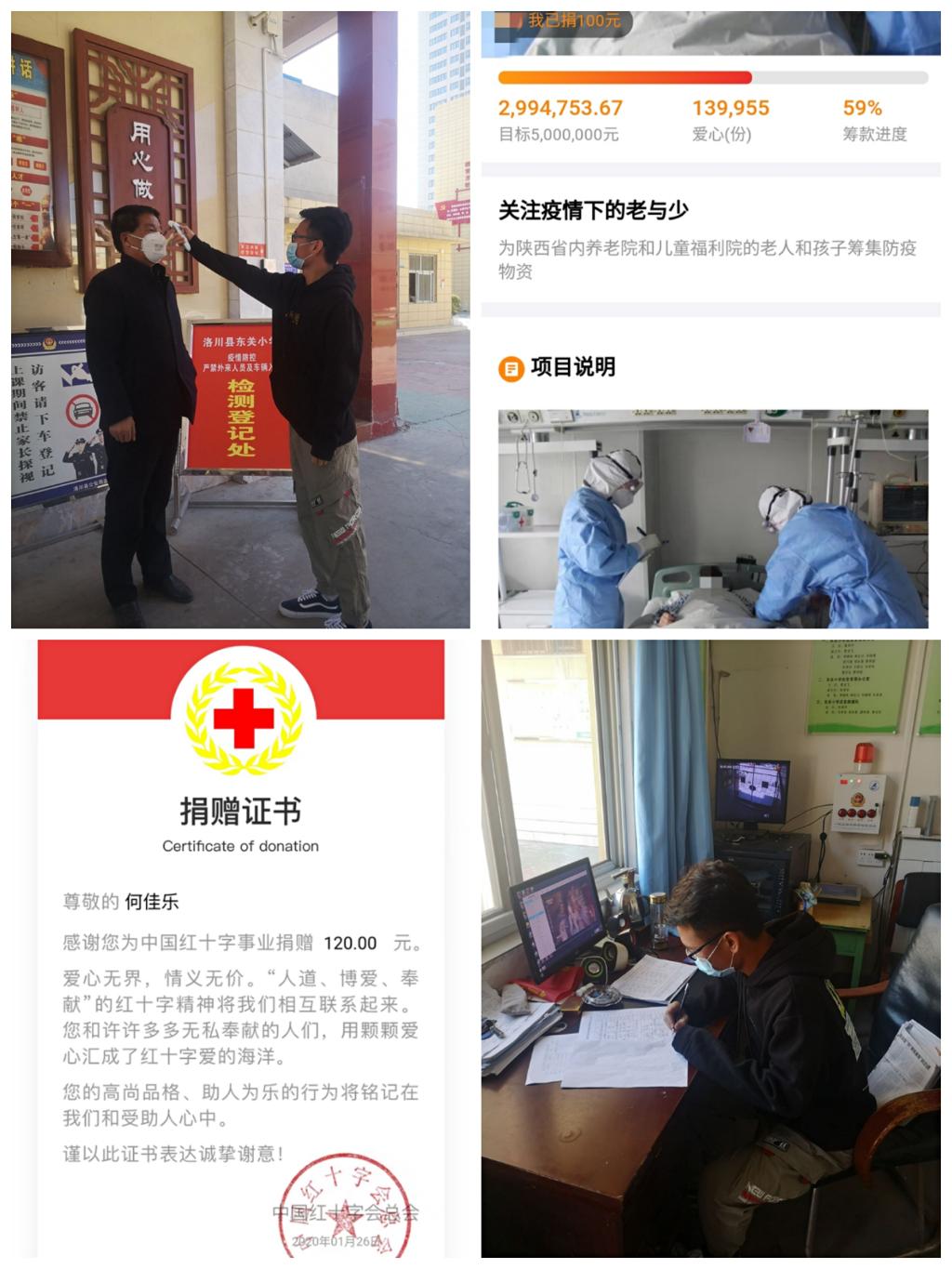 學(xué)生第三黨支部黨員杜丹陽同志在疫情防控工作中主動擔(dān)當(dāng),身先士卒。作為一名學(xué)生黨員,杜丹陽同志在家鄉(xiāng)疫情防控工作中主動請纓,參與寶雞市鳳翔縣虢王鎮(zhèn)劉淡村村委會組織的黨員服務(wù)活動,在劉淡村南路口卡點處協(xié)助登記進(jìn)出入車輛及人員,協(xié)助村干部開展防疫宣傳;作為一名學(xué)生干部,他積極踐行志愿服務(wù),積極幫助班級同學(xué),建立并參與四六級打卡群,進(jìn)行考研知識分享,同時通過“支付寶”平臺給陜西省內(nèi)養(yǎng)老院和兒童福利院的老人和孩子籌集防疫物資并進(jìn)行捐款,用自身行動詮釋了共產(chǎn)黨員的責(zé)任與擔(dān)當(dāng)。