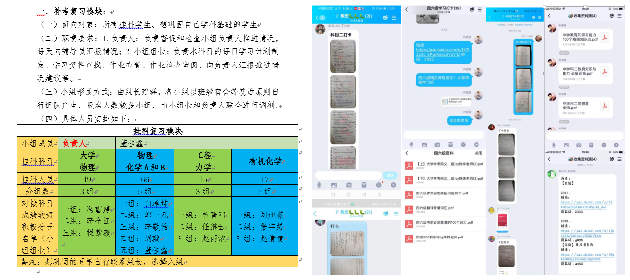 2017級本科生黨支部結(jié)合年級特點,依托前期定崗設(shè)責(zé),下沉班級開展“自主學(xué)習(xí),我在行”主題黨日活動,在疫情期間開展特殊學(xué)業(yè)幫扶活動。分別設(shè)立考研、四六級、教資三個幫幫圈,堅持 “每日學(xué)習(xí)打卡制度”,專人監(jiān)督記錄學(xué)習(xí)打卡情況,設(shè)立獎懲機制;持續(xù)更新學(xué)習(xí)資料,以三日為一個周期進(jìn)行發(fā)布;黨員與學(xué)業(yè)困難學(xué)生一對一線上幫扶,每周群內(nèi)公示幫扶進(jìn)度,截止今日,幫幫圈覆蓋面達(dá)年級75%,切實做到停課不停學(xué),學(xué)習(xí)戰(zhàn)“疫”不掉隊,開學(xué)領(lǐng)跑第一步;2018級本科生黨支部通過前期深入調(diào)研,了解到學(xué)生的亟待訴求分為四方面:1.補考復(fù)習(xí);2.課前預(yù)習(xí);3.四六級學(xué)習(xí);4.考證學(xué)習(xí)。針對四方面訴求,分派任務(wù)到人,設(shè)立明確學(xué)習(xí)目標(biāo)、學(xué)習(xí)進(jìn)度表和項目負(fù)責(zé)人,確保職責(zé)到人、幫扶到位、服務(wù)落實;2016級本科黨員陳鑫國義無反顧加入寶雞市鳳翔縣指揮鎮(zhèn)連村的疫情防控志愿者工作,協(xié)助村干部做好排查登記,宣傳新型冠狀病毒肺炎的相關(guān)知識,默默貢獻(xiàn)力量。