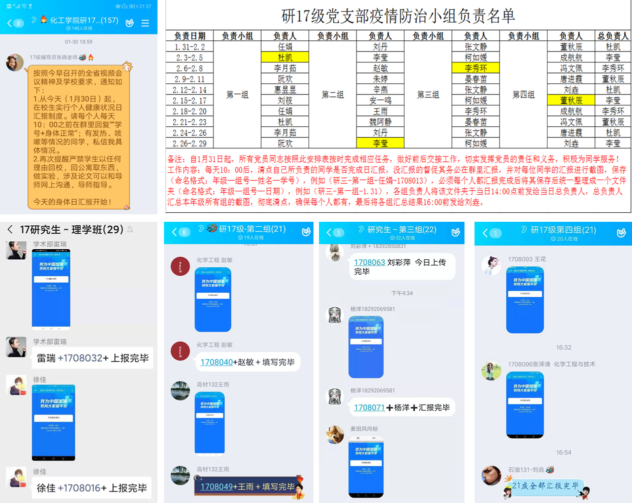 早上8點(diǎn),準(zhǔn)時(shí)匯報(bào)年級(jí)學(xué)生健康情況;隨時(shí)接收通知,第一時(shí)間編輯、逐一發(fā)送給學(xué)生,直到所有學(xué)生一一回復(fù);中午12點(diǎn)、晚上19:00,定時(shí)查看學(xué)生健康情況;和學(xué)生語音、視頻、電話,詢問家庭經(jīng)濟(jì)困難學(xué)生經(jīng)濟(jì)上是否受到疫情影響;在班委群、年級(jí)群和同學(xué)們進(jìn)行交流,順帶給學(xué)生們布置“寒假作業(yè)”,再檢查一遍給學(xué)生們傳達(dá)的學(xué)校最新通知有無遺漏……面向?qū)W生的“線上一天”暫告一段落。21:00,匯總學(xué)生當(dāng)日健康狀況數(shù)據(jù),經(jīng)過3遍核對(duì)無誤后報(bào)送……這是環(huán)境學(xué)院輔導(dǎo)員李丹戰(zhàn)“疫”中的一天,也是學(xué)校全體輔導(dǎo)員戰(zhàn)“疫”中的每一天。
