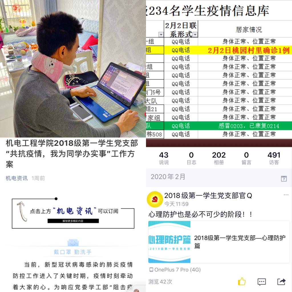 2月7日以來,機(jī)電學(xué)院輔導(dǎo)員王正宏組織支部黨員構(gòu)建1+6戰(zhàn)“疫”模式,通過網(wǎng)絡(luò)發(fā)起1場(chǎng)“共抗疫情,我為同學(xué)辦實(shí)事”主題黨日活動(dòng),支部對(duì)口的30名入黨積極分子加入,迅速組建成6個(gè)工作組,全員行動(dòng)助力疫情防控,服務(wù)同學(xué)。信息組構(gòu)建年級(jí)網(wǎng)格化管理矩陣,每日協(xié)助輔導(dǎo)員了解學(xué)生信息、居家困惑及心理、學(xué)業(yè)需求;科普組累計(jì)發(fā)布疫情信息、防護(hù)知識(shí)43條;宅家攻略組發(fā)布居家健身、心理防護(hù)知識(shí)3期;學(xué)業(yè)幫扶組根據(jù)47名同學(xué)學(xué)業(yè)幫扶需求,每日開展線上答疑、打卡活動(dòng);學(xué)生返校工作籌備組提前建立專業(yè)學(xué)生返校工作方案,為學(xué)院學(xué)生返校健康篩查、入住宿舍、學(xué)習(xí)生活做好準(zhǔn)備。