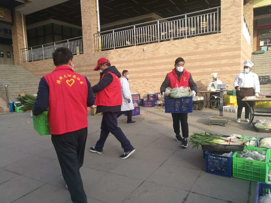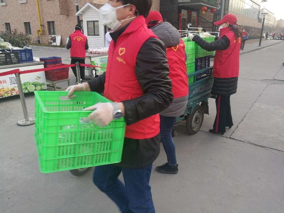 志愿者們齊心協(xié)力將蔬菜搬放到供應(yīng)點(diǎn)指定位置