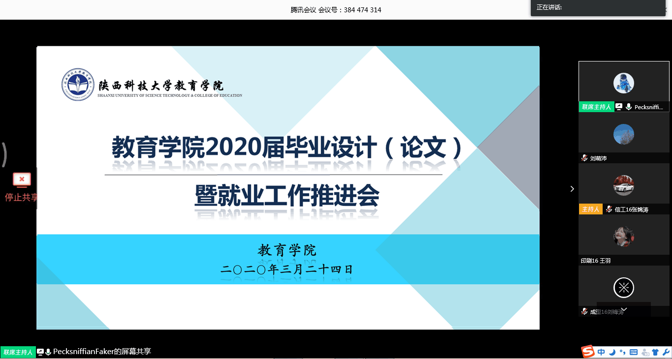 3月24日下午17時(shí),教育學(xué)院通過(guò)騰訊視頻會(huì)議,召開了2020屆畢業(yè)生畢業(yè)設(shè)計(jì)(論文)工作暨就業(yè)線上推進(jìn)會(huì)。副院長(zhǎng)郭國(guó)法主持了本次線上工作會(huì),學(xué)院黨政領(lǐng)導(dǎo)、各專業(yè)畢業(yè)設(shè)計(jì)(論文)負(fù)責(zé)人、職能部門相關(guān)老師及全體2020屆畢業(yè)生參加了本次推進(jìn)會(huì)。