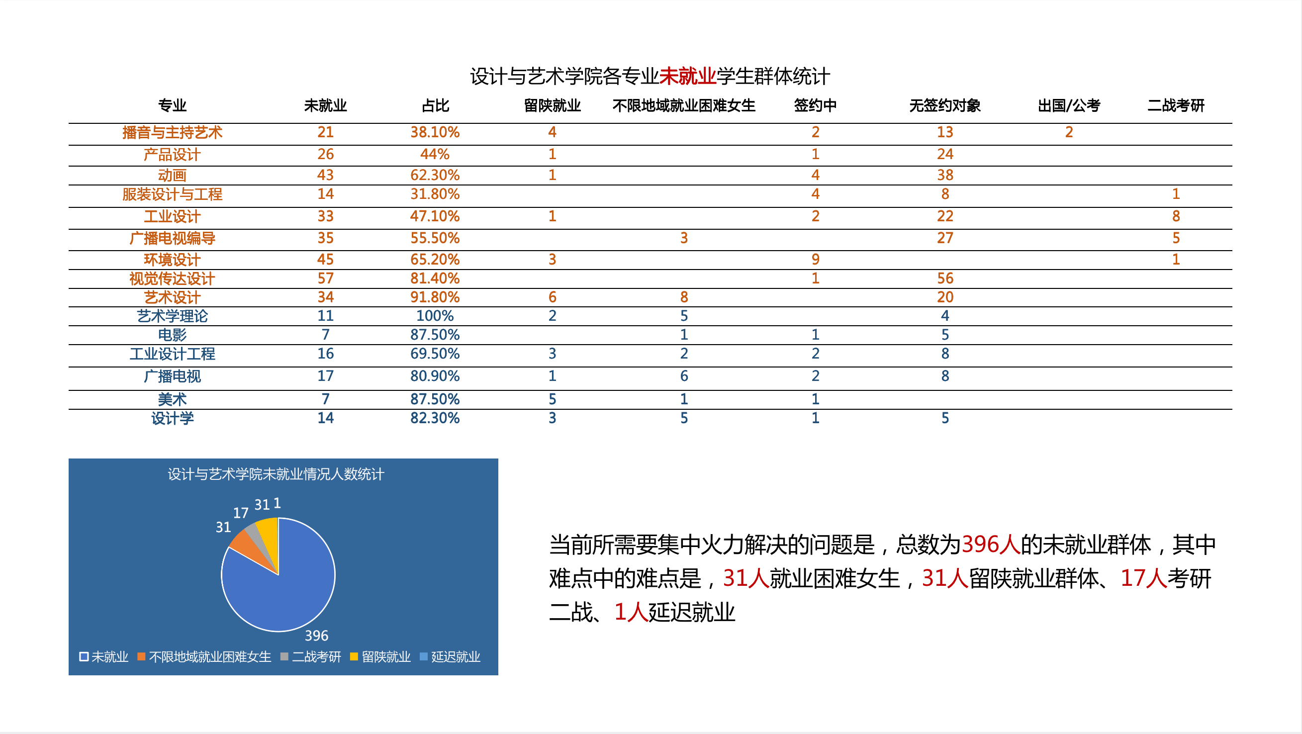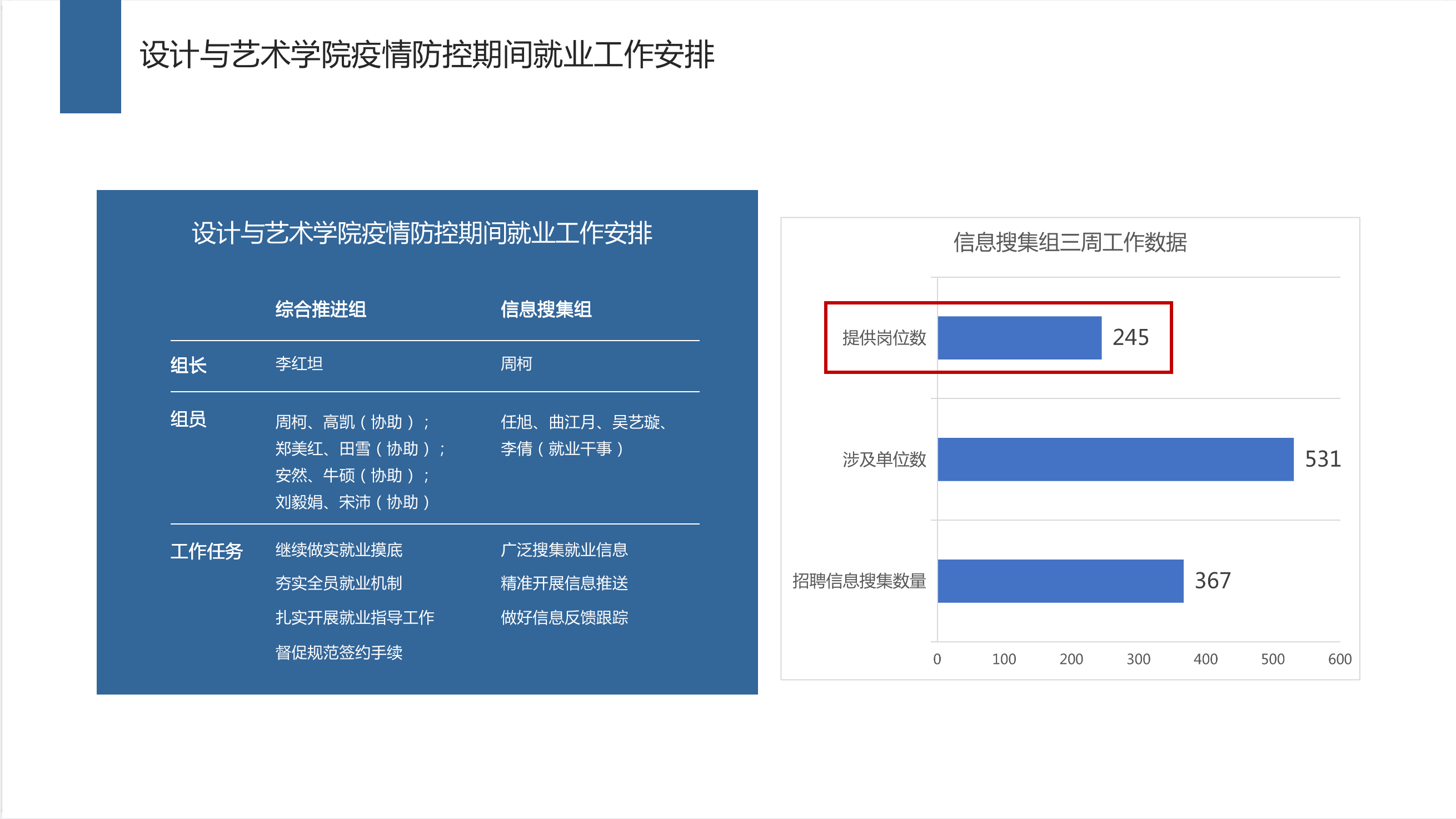 分門(mén)分類(lèi)準(zhǔn)確摸底,因人因需實(shí)施指導(dǎo)。根據(jù)《設(shè)計(jì)與藝術(shù)學(xué)院疫情防控期間的就業(yè)工作安排》,疫情防控期間,學(xué)院要求學(xué)生系統(tǒng)全體人員參與就業(yè)工作推進(jìn),并制定了全面摸底、梳理難題、各個(gè)擊破的實(shí)施思路。根據(jù)畢業(yè)班輔導(dǎo)員的調(diào)研反饋,本科的視覺(jué)傳達(dá)設(shè)計(jì)、服裝與服飾設(shè)計(jì)、服裝設(shè)計(jì)與工程專(zhuān)業(yè)、研究生的藝術(shù)學(xué)理論、藝術(shù)設(shè)計(jì)、設(shè)計(jì)學(xué)、廣播電視專(zhuān)業(yè)用人單位招聘崗位數(shù)量明顯下降,部分專(zhuān)業(yè)下降率甚至達(dá)到30%。針對(duì)該趨勢(shì),學(xué)院將全體輔導(dǎo)員分為信息搜集組和綜合工作組兩個(gè)工作小組開(kāi)展工作。工作開(kāi)展三周以來(lái),工作組共搜集招聘信息367條,涉及單位數(shù)531家,提供崗位數(shù)245個(gè),開(kāi)展專(zhuān)場(chǎng)招聘會(huì)3場(chǎng),聯(lián)絡(luò)校友企業(yè)開(kāi)展招聘會(huì)1場(chǎng);同時(shí),針對(duì)2020屆畢業(yè)近400人的未就業(yè)群體進(jìn)行了詳細(xì)、周密的分類(lèi)摸底,并建立工作臺(tái)帳,根據(jù)其不同需求進(jìn)行崗位分揀,精準(zhǔn)推送;針對(duì)26名“三類(lèi)學(xué)生”、17名“考研二戰(zhàn)”、31名“留陜就業(yè)需求”、31名“就業(yè)困難女生”等學(xué)生群體為其建立“一對(duì)一”幫扶臺(tái)賬,并逐一聯(lián)系畢業(yè)設(shè)計(jì)指導(dǎo)教師或碩士生導(dǎo)師,共同為其制定就業(yè)幫扶策略。