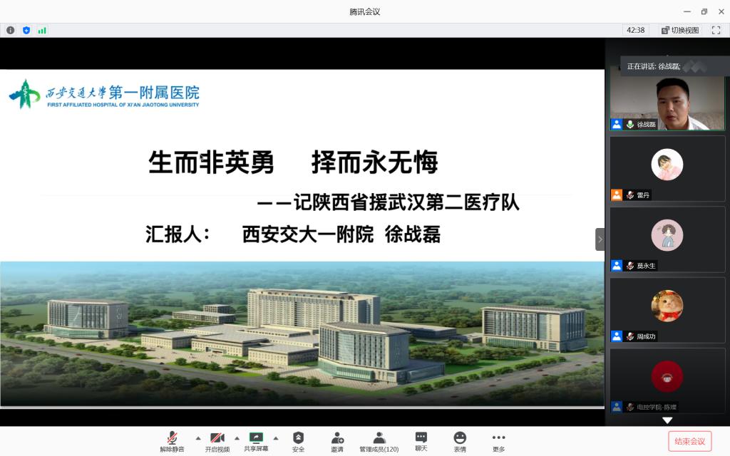 本次理論授課由西安交通大學(xué)第一附屬醫(yī)院心內(nèi)科重癥監(jiān)護(hù)室主管護(hù)理師徐戰(zhàn)磊主講,授課主題是“生而非英勇,擇而永無悔”,以陜西省援武漢第二醫(yī)療隊在救治行動前后的情況為授課主線,帶大家形象直觀地了解醫(yī)療隊的整體情況,簡明扼要地敘述救治工作狀況,深入淺出地描述和分析援助期間遇到的問題,并指出了醫(yī)療隊四大亮點,最后同大家分享了自己的抗疫感悟。