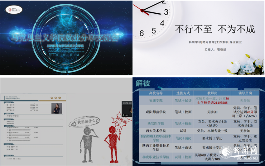 分享會(huì)上,王思嘉結(jié)合自身從鄉(xiāng)鎮(zhèn)村官到縣直機(jī)關(guān),再到市委組織部,后又考入省人防辦,幾年來(lái)公務(wù)員考試的親身經(jīng)歷,從“是什么?為什么?怎么考?”三個(gè)方面進(jìn)行了公務(wù)員考試的經(jīng)驗(yàn)分享,提醒同學(xué)們備考公務(wù)員,首先要正確理解公務(wù)員的職業(yè)屬性,其次要合理設(shè)定職業(yè)目標(biāo),第三要掌握科學(xué)高效的備考方法。即將入職咸陽(yáng)師范學(xué)院思政課教師的石艷嬌同學(xué),首先用“我想做什么?”和“我能做什么?”引發(fā)同學(xué)們思考,緊接著從就業(yè)前提、就業(yè)要求和就業(yè)準(zhǔn)備三方面,最后提醒同學(xué)們要善于學(xué)習(xí),敢于嘗試,不斷提升自己,積極主動(dòng)提前做好求職各項(xiàng)準(zhǔn)備。簽約楊凌職業(yè)技術(shù)學(xué)院思政課教師的霍登煌同學(xué),分別“從目標(biāo)定位:知己解彼此”“優(yōu)化簡(jiǎn)歷:推銷自我”“暢通信息:沉著報(bào)考”三個(gè)方面,結(jié)合求職經(jīng)歷,帶領(lǐng)大家一起分析了就業(yè)方向和面試基本要求、簡(jiǎn)歷制作技巧、備考注意事項(xiàng)等,并針對(duì)會(huì)前收集到的同學(xué)普遍關(guān)注的求職和學(xué)業(yè)問(wèn)題,一一解答。