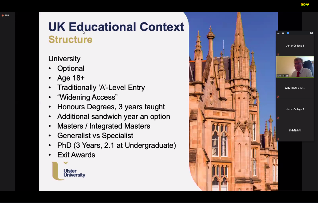 本次系列培訓(xùn)特邀阿爾斯特大學(xué)計算機、工程與建筑環(huán)境學(xué)部副部長Paul Hanna主講。他分別以英國教育體系、專業(yè)設(shè)置及質(zhì)量保障體系、教學(xué)考核及評估為主題,結(jié)合實際情況和具體案例,加深阿爾斯特學(xué)院教師對英國教育體系架構(gòu)、學(xué)位授予情況、專業(yè)建設(shè)及質(zhì)量保障、教學(xué)反饋機制、教學(xué)效果評估等方面的認識。他表示,受疫情影響,雙方暫定推遲赴英培訓(xùn)計劃,在線上開展培訓(xùn)和課程對接,他非常感謝我校授課教師對此次培訓(xùn)安排的理解和支持。通過這次培訓(xùn),他充分感受到教師們積極參與的熱情和對教學(xué)認真負責(zé)的態(tài)度。