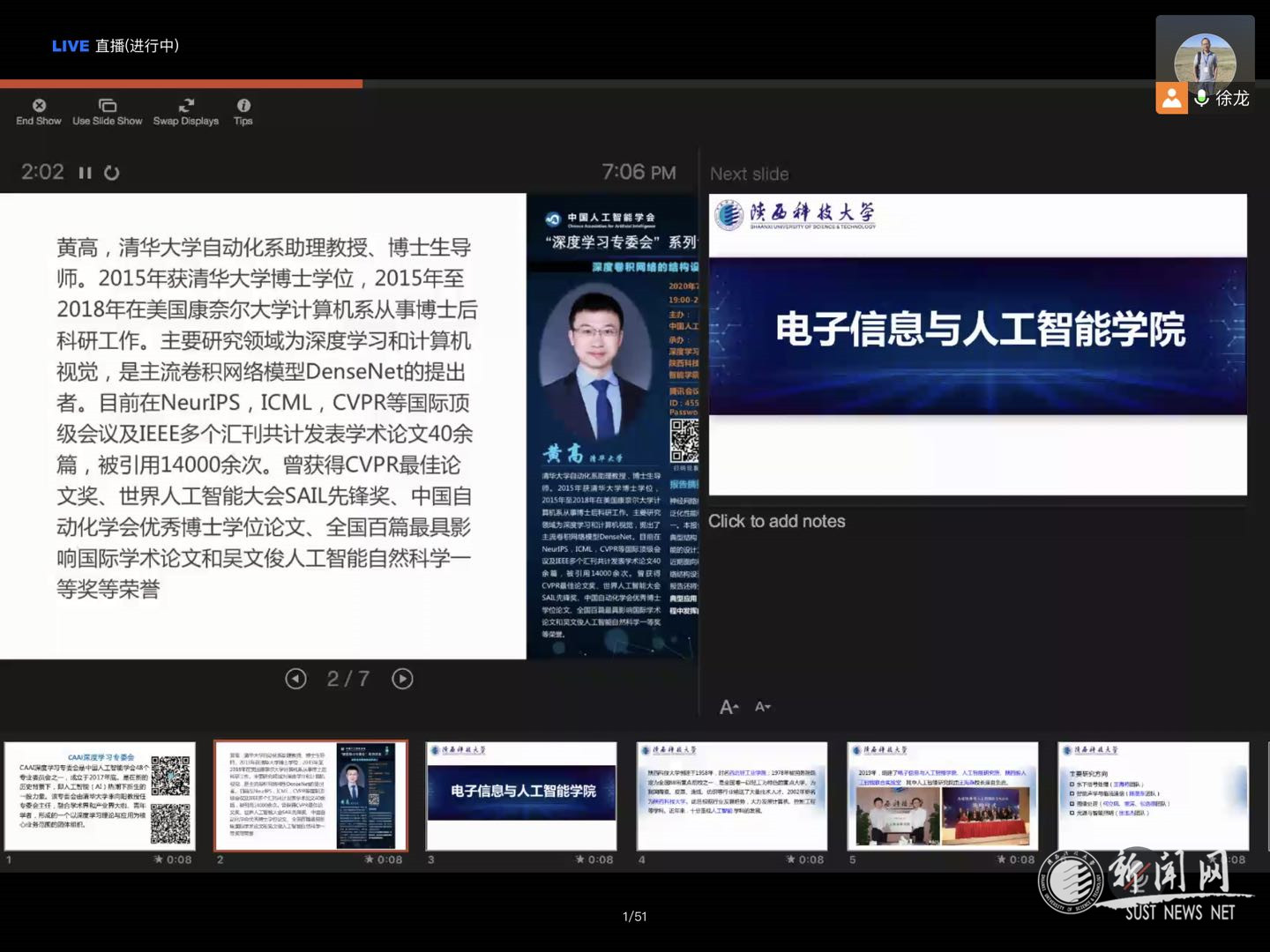 我校張選德教授介紹陜西科技大學電智學院與人工智能研究院的基本情況,并對深度學習專委會對我校人工智能研究發(fā)展的關心表示感謝。