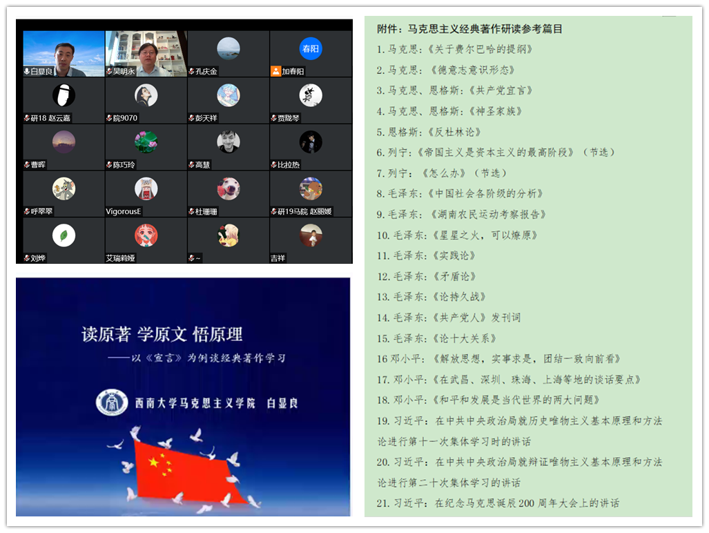 啟動會上,西南大學馬克思主義學院院長白顯良教授,受邀通過云端平臺為我院師生作了題為《讀原著學原文悟原理——以〈宣言〉為例談經(jīng)典著作學習》的“經(jīng)典著作導讀”專題講座。白顯良教授首先從“為什么讀”“怎么讀”馬克思主義經(jīng)典著作兩個問題切入,進行答疑解惑,之后,以《共產黨宣言》為例,從這是一部什么樣的書、主要講了什么內容、為什么今天還要學、應該如何學習研讀等四個方面,就如何進行馬克思主義經(jīng)典著作研讀,進行了精彩紛呈的講解。他認為,經(jīng)典著作猶如陳壇老酒,需要慢慢品味,具有歷久彌新的永恒魅力。通過聆聽報告,與會師生不僅感受到《共產黨宣言》所飽含的思想魅力和真理力量,更加深了對研讀經(jīng)典著作重要性的理解和認識。