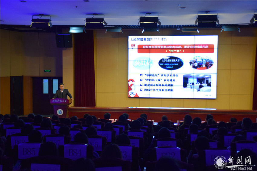 講座中,馬建中從“互聯(lián)網(wǎng)+”大學(xué)生創(chuàng)新創(chuàng)業(yè)大賽談起,通過“創(chuàng)新興趣、創(chuàng)新意識、創(chuàng)新思維、創(chuàng)新方法、創(chuàng)新實踐、創(chuàng)新成果”六個方面闡述了對培養(yǎng)創(chuàng)新型人才的理解。他結(jié)合自身從求學(xué)、深造到帶領(lǐng)團隊勇攀科研高峰,取得一項又一項可觀的學(xué)術(shù)成果,輸出一批又一批科研人才的鮮活案例,向到場的師生講述了他對如何培養(yǎng)創(chuàng)新思維和提升創(chuàng)新能力的獨到見解。突出強調(diào)了在校大學(xué)生要從主動培養(yǎng)創(chuàng)新興趣入手,積極參與學(xué)術(shù)競賽和科研實踐活動。馬建中談到一個有志于成為創(chuàng)新人才的年輕人,只有在成長之路上堅持“有心、留心、用心、細心、恒心和信心”才能成就一個青年大學(xué)生的科研之路。