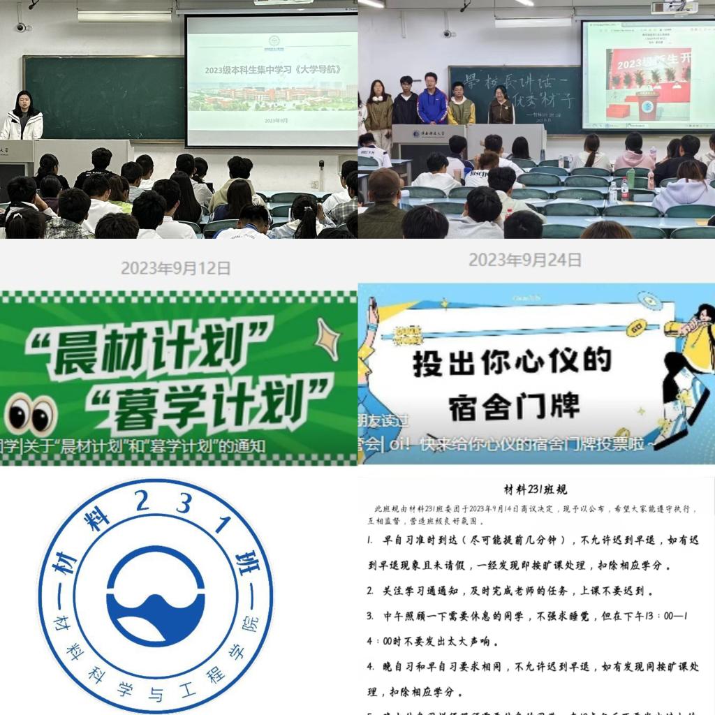 聚焦規(guī)矩意識(shí) 強(qiáng)化日常管理。通過新生入學(xué)教育大會(huì),集中學(xué)習(xí)《校長(zhǎng)李志健在2023級(jí)新生開學(xué)典禮暨軍訓(xùn)動(dòng)員大會(huì)上的講話》《大學(xué)導(dǎo)航》《陜西科技大學(xué)章程》等教育內(nèi)容,幫助新生明確學(xué)校規(guī)章制度,培養(yǎng)新生規(guī)矩意識(shí);2023級(jí)新生自進(jìn)入正常教學(xué)周起,全員參與材料學(xué)院晨材計(jì)劃、暮學(xué)計(jì)劃,豐富校園生活,保持學(xué)習(xí)熱情,營(yíng)造了良好的學(xué)習(xí)氛圍和優(yōu)良學(xué)風(fēng);各班依照《大學(xué)導(dǎo)航》制定《班級(jí)規(guī)定》及班級(jí)標(biāo)識(shí)體系,將個(gè)人行為與集體榮譽(yù)密切集合,建立向上向好向?qū)W班風(fēng);學(xué)院自管會(huì)開展宿舍門牌設(shè)計(jì)大賽,創(chuàng)造文明寢室環(huán)境,創(chuàng)建和諧宿舍舍風(fēng);同時(shí)針對(duì)日常管理、學(xué)籍管理、活動(dòng)參與等開展專項(xiàng)教育,引導(dǎo)學(xué)生強(qiáng)化主體意識(shí),激發(fā)自律自省。