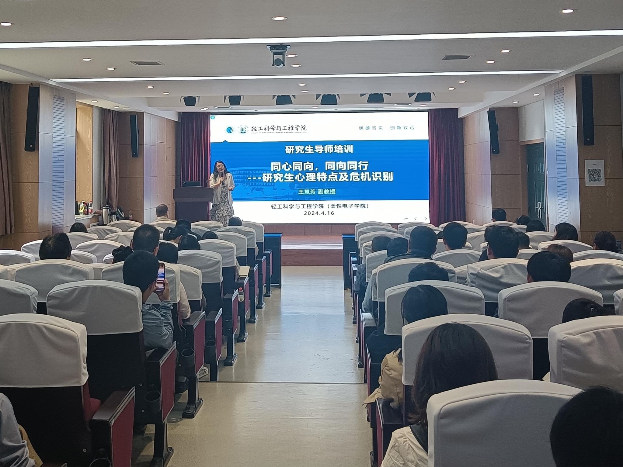 為提升學(xué)院研究生導(dǎo)師識(shí)別學(xué)生心理狀況、關(guān)注學(xué)生身心健康方面的工作能力,加強(qiáng)研究生導(dǎo)師心理健康教育水平,建設(shè)更加和諧的導(dǎo)學(xué)關(guān)系,4月16日下午,輕工科學(xué)與工程學(xué)院(柔性電子學(xué)院)于學(xué)院學(xué)術(shù)報(bào)告廳舉辦主題為“同心同享,同向同行——研究生心理特點(diǎn)及危機(jī)識(shí)別”的研究生導(dǎo)師心理健康教育專題培訓(xùn)會(huì)。本次培訓(xùn)由校心理健康教育中心副教授王慧芳主講,全體研究生導(dǎo)師和研究生輔導(dǎo)員參加學(xué)習(xí)。培訓(xùn)會(huì)由輕工學(xué)院副院長(zhǎng)劉國(guó)棟主持。