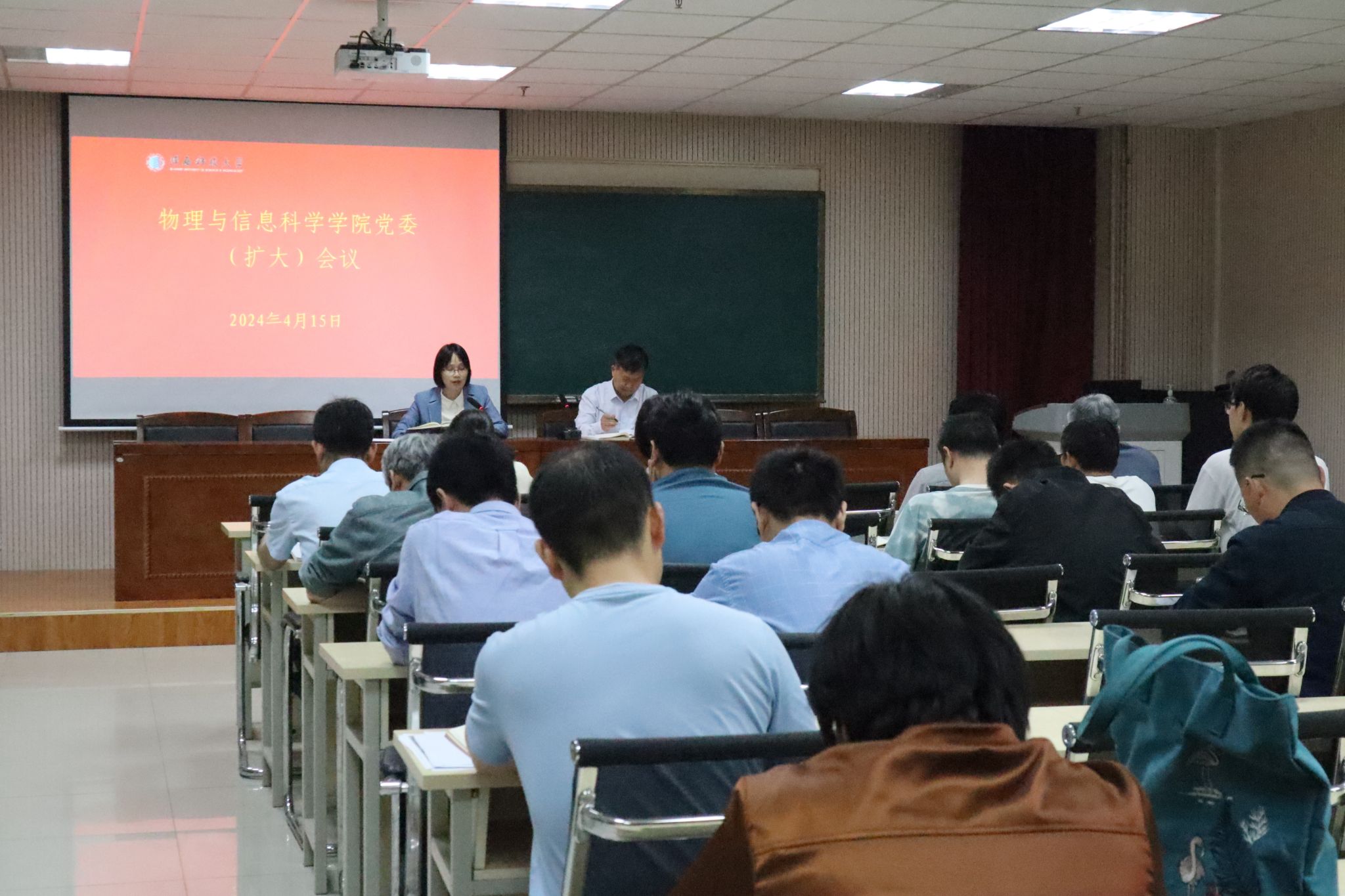 4月15日,物理與信息科學(xué)學(xué)院黨委召開學(xué)院黨委(擴(kuò)大)會(huì)議,安排部署學(xué)院黨紀(jì)學(xué)習(xí)教育工作。會(huì)議由院黨委書記陳源梅主持,學(xué)院黨委委員、全體教師黨員及學(xué)生黨支部書記、副書記參加會(huì)議。