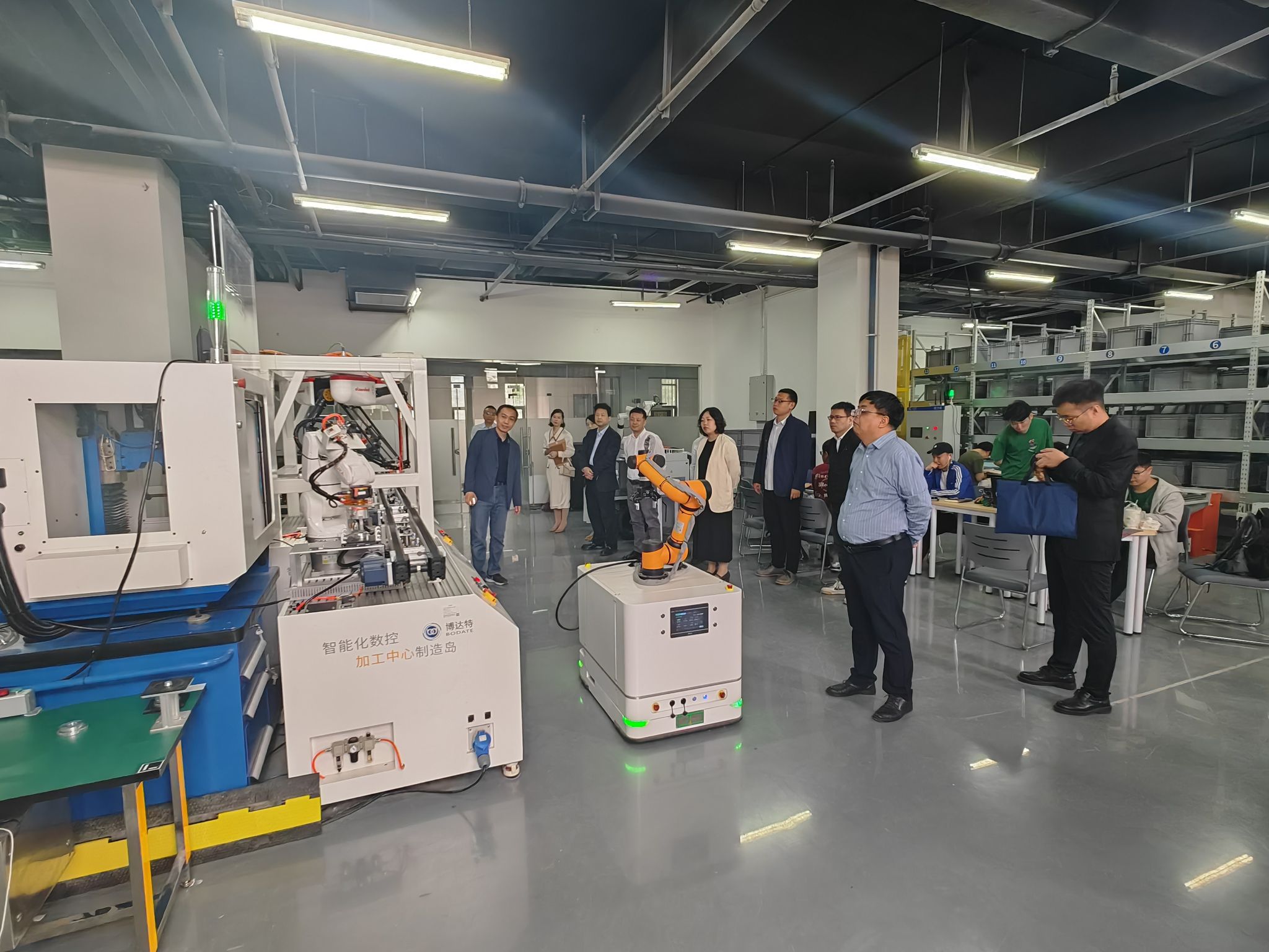 在中瑞GF智能制造創(chuàng)新研究院,考察了智能制造生產(chǎn)線、正在調(diào)試中的五軸加工中心、導(dǎo)軌機(jī)器人,以及智能倉儲穿梭車系統(tǒng)。在智能制造柔性生產(chǎn)線中,具有語音功能的AGV小車自動對各加工工位進(jìn)行導(dǎo)覽和講解,MES系統(tǒng)大屏幕能夠自動顯示產(chǎn)線運(yùn)行狀態(tài)和生產(chǎn)信息,產(chǎn)線中的機(jī)器人、傳送帶、加工單元有條不紊的工作,展示了現(xiàn)代制造生產(chǎn)線的運(yùn)行狀況。在加工制造區(qū)域,MES系統(tǒng)顯示屏幕顯示兩臺加工中心的加工信息,地軌機(jī)器人能夠?qū)⒃牧戏湃胍慌_加工中心加工,并將粗加工的產(chǎn)品取出,放入另一臺加工中心進(jìn)行精密加工,加工完畢后,將產(chǎn)品取出放入倉位。張琳對機(jī)電學(xué)院在智能制造、柔性生產(chǎn)線方面的研發(fā)條件、實驗環(huán)境表示贊賞,希望學(xué)院能夠利用好這些科研條件,與浐灞國際港達(dá)成深度合作。趙江民就柔性生產(chǎn)線、穿梭車技術(shù)與參加培訓(xùn)的教師、研究生進(jìn)行了交流。