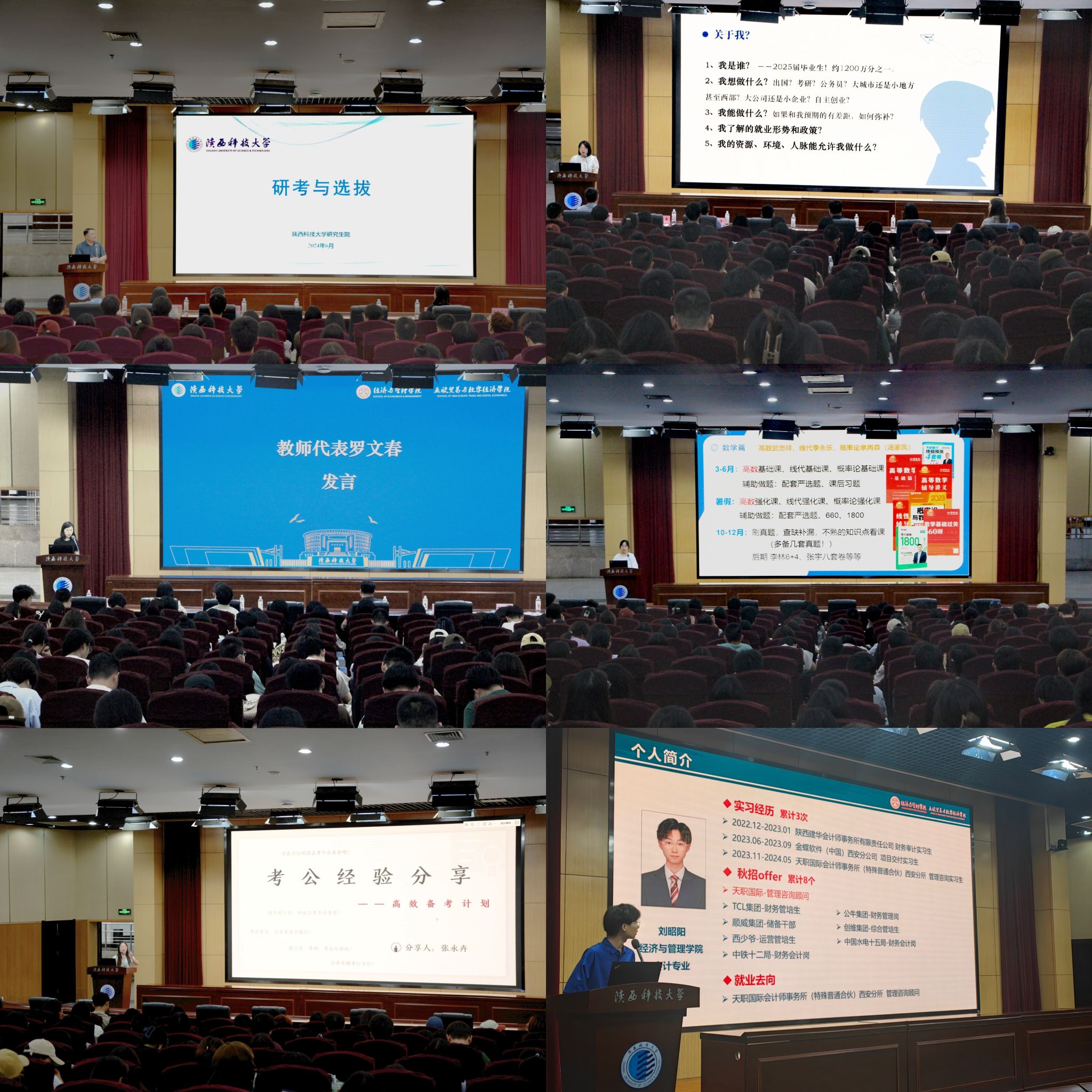 會上,研究生院李成龍以“研考與選拔”為題,以詳實(shí)的數(shù)據(jù)分析,全面分析了就業(yè)升學(xué)形勢演變、研考政策變遷和近年考研情況,并對我校的研究生招錄情況進(jìn)行了系統(tǒng)說明,為同學(xué)們提供了大量寶貴的參考信息,提出了具有操作性及針對性的發(fā)展建議。學(xué)生就業(yè)指導(dǎo)中心張蕓結(jié)合大學(xué)生就業(yè)環(huán)境分析為切入點(diǎn),指出近年畢業(yè)生連續(xù)增長,從市場現(xiàn)狀、行業(yè)發(fā)展及對人才需求方面進(jìn)行分析,從宏觀與微觀層面為學(xué)生謀劃就業(yè)提供了大量有效的信息。人力資源管理專業(yè)系主任羅文春結(jié)合企業(yè)單位人才需求、自身及校友發(fā)展經(jīng)歷等問題,鼓勵同學(xué)們努力提升學(xué)歷層次,積極挺進(jìn)更高層次人才隊(duì)伍服務(wù)行業(yè)、服務(wù)社會。陶興旺圍繞“就業(yè)形勢”“樹立正確的就業(yè)觀念、就業(yè)心態(tài)”等現(xiàn)實(shí)性問題提出了具體建議。