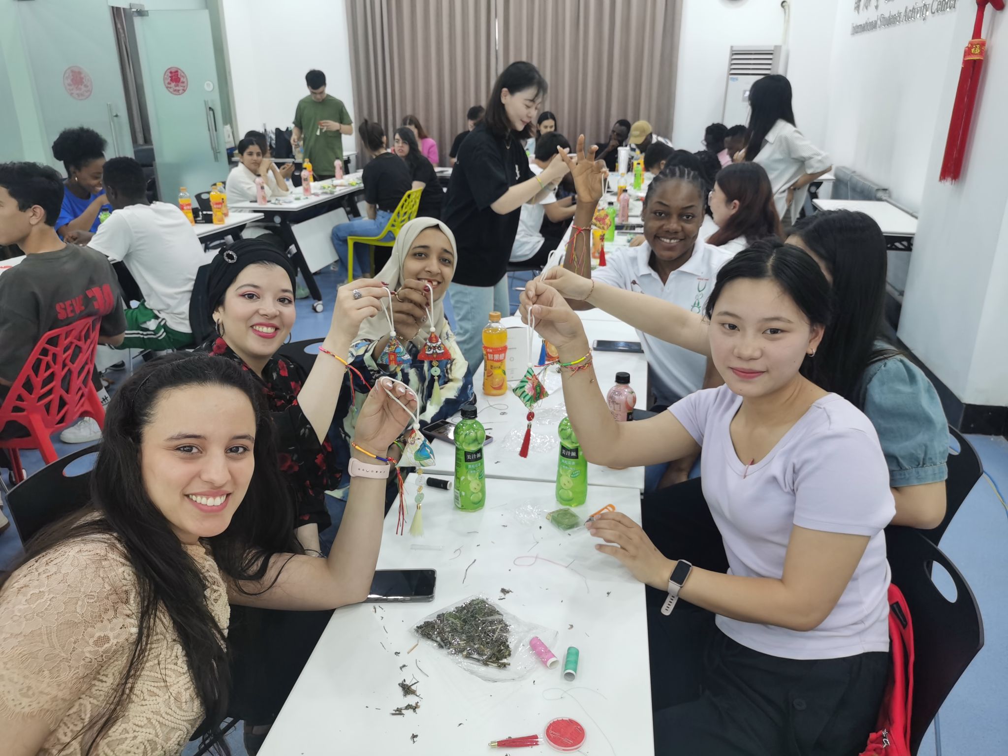 接下來(lái),薛鈺老師示范并指導(dǎo)留學(xué)生手工縫制端午香囊,在國(guó)際社中國(guó)學(xué)生的幫助下,留學(xué)生們紛紛拿起材料,穿針引線,裝入香料,仔細(xì)縫合,裝飾流蘇,在一針一線中寄托著對(duì)健康、平安的美好祝愿。在繪制端午團(tuán)扇過(guò)程中,留學(xué)生們發(fā)揮自己的想象力和創(chuàng)造力,用手中的畫筆描繪出美麗的圖案,繪制出一柄屬于自己的團(tuán)扇,活動(dòng)現(xiàn)場(chǎng)中外學(xué)生配合默契,洋溢著溫馨的節(jié)日氣氛。