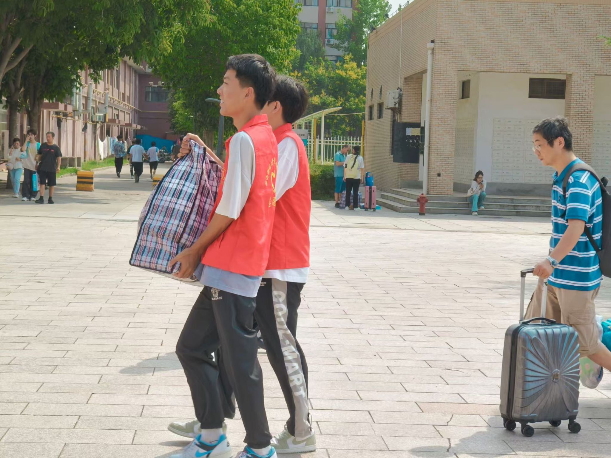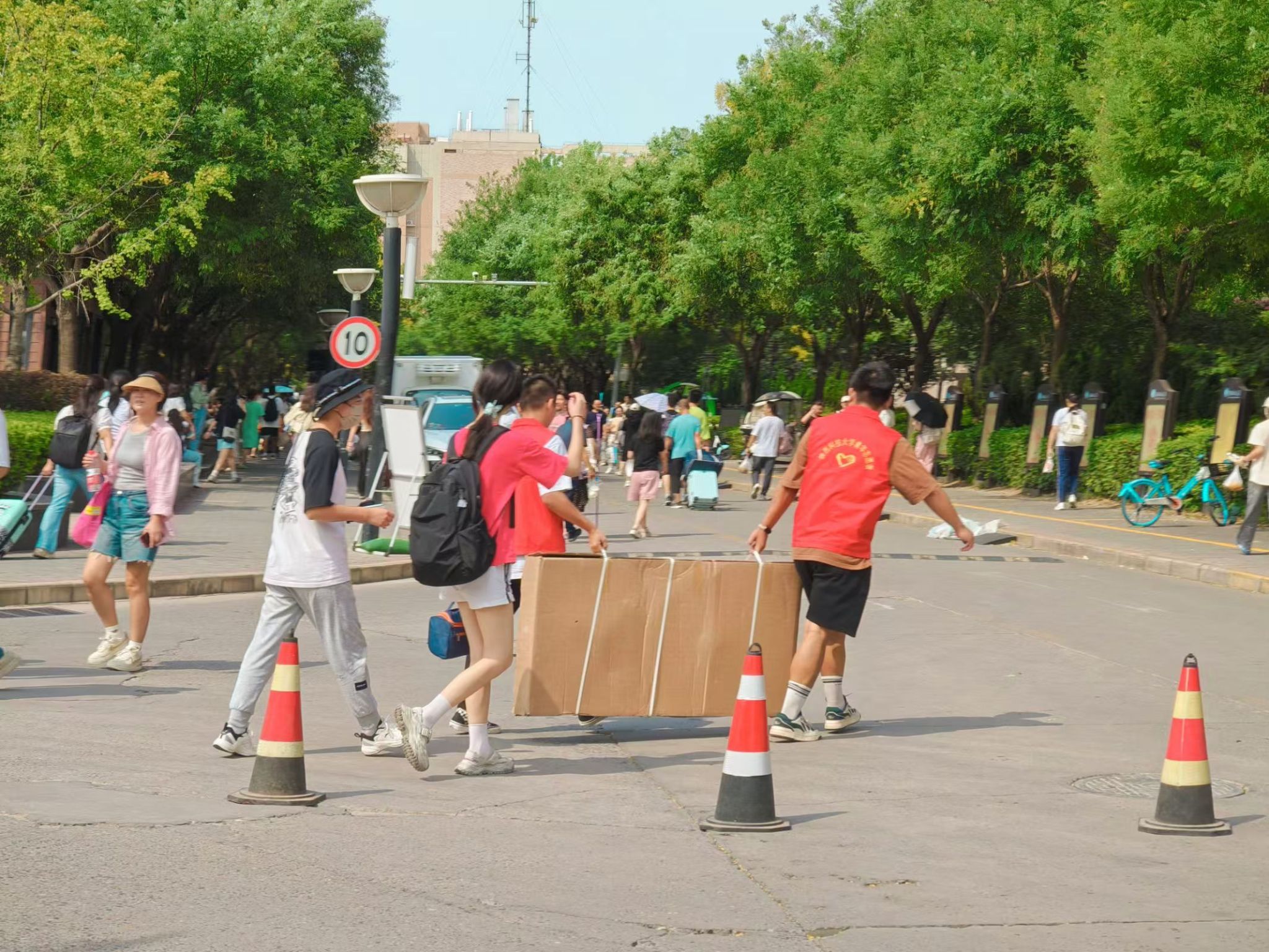 為保證新生安全有序便捷的進(jìn)入校園,全校共計1400余人次志愿者、準(zhǔn)備30多個手推車為新生搬運(yùn)行李,大家互相配合組成了一支高效的運(yùn)輸隊(duì)伍。志愿者們在烈日下齊心協(xié)力,第一時間向行李繁多的新生伸出援助之手,熱情洋溢地將新同學(xué)的行李送至公寓樓下,用實(shí)際行動為新生入學(xué)暖心護(hù)航。