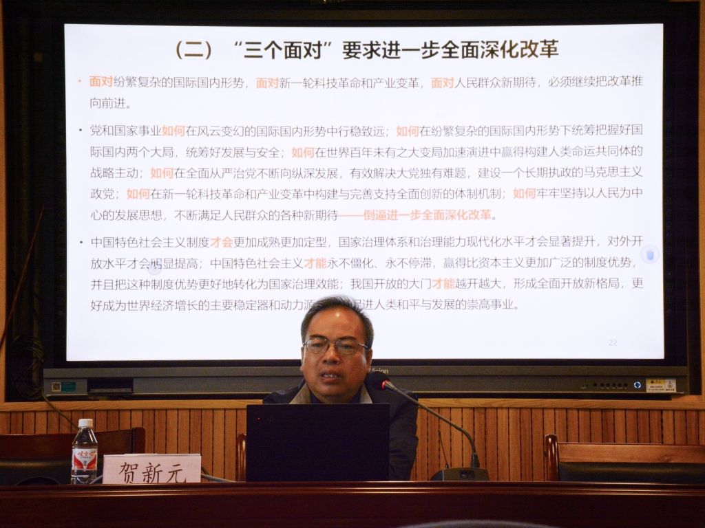 賀新元教授結(jié)合黨的二十屆三中全會精神,圍繞為什么要推進(jìn)中國式現(xiàn)代化,為什么推進(jìn)中國式現(xiàn)代化要進(jìn)一步全面深化改革,如何進(jìn)一步全面深化改革以及進(jìn)一步全面深化改革、推進(jìn)中國式現(xiàn)代化必須遵循的原則等重大問題,依次展開詳細(xì)闡述和深入分析,對師生全面理解和準(zhǔn)確把握全會精神具有很強(qiáng)的指導(dǎo)意義。