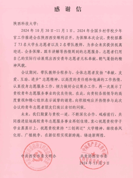 近日,中共西安市委文明辦、共青團西安市委給我校發(fā)來感謝信,對我校在2024年全國鄉(xiāng)村學(xué)校少年宮工作推進會中的大力支持表示感謝,對我校志愿者在本次會議中的志愿服務(wù)給予了高度肯定。