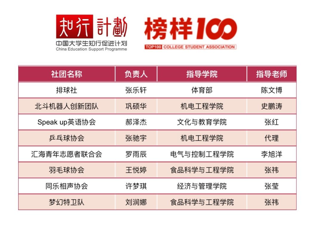 近日,知行計劃“榜樣100|全國優(yōu)秀大學生社團及團隊征集活動”榜單正式揭曉,共吸引來自全國286所高校的1,266支團隊報名,經(jīng)過評選,最終806支團隊脫穎而出,榮登榜單。我?!芭徘蛏纭?、“北斗機器人創(chuàng)新團隊”、“Speak up英語協(xié)會”、“乒乓球協(xié)會”、“匯海青年志愿者聯(lián)合會”、“羽毛球協(xié)會”、“同樂相聲協(xié)會”、“夢幻特衛(wèi)隊”等8支學生社團榮登榜單。