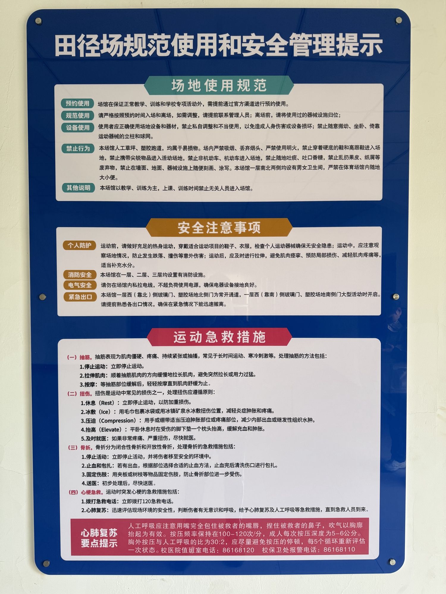 為進(jìn)一步提高師生運(yùn)動(dòng)的安全防護(hù),體育部組織對(duì)北區(qū)體育館燈光進(jìn)行升級(jí)更換,在所有體育場館內(nèi)顯著位置安裝安全提示三色板,通過強(qiáng)調(diào)場館規(guī)范使用說明、場館使用安全注意事項(xiàng)、運(yùn)動(dòng)損傷急救等內(nèi)容,提醒使用者注意安全事項(xiàng),增強(qiáng)自我保護(hù)意識(shí)。堅(jiān)持常態(tài)化的場地安全檢查制度,專人記錄檢查結(jié)果,及時(shí)建立工作臺(tái)賬,跟蹤場地設(shè)施問題整改,從問題發(fā)現(xiàn)到問題解決實(shí)現(xiàn)閉環(huán)管理,確保隱患無處遁形。
