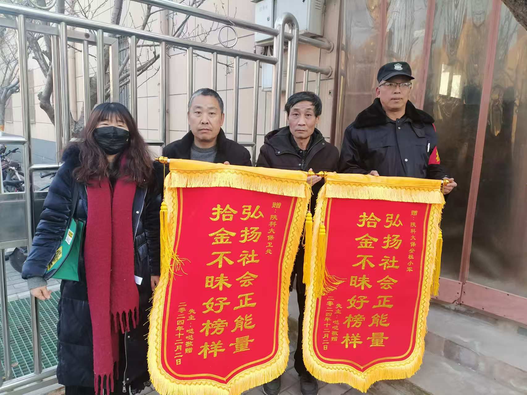12月17日,一位來自陜科大社區(qū)的居民到咸陽(yáng)校區(qū)管委會(huì)保衛(wèi)部,將一面寫有“弘揚(yáng)社會(huì)正能量 拾金不昧好榜樣”大紅錦旗鄭重地送到保安杜小軍和保衛(wèi)部工作人員的手上。事發(fā)當(dāng)天,小區(qū)保安杜小軍執(zhí)勤時(shí)在路邊發(fā)現(xiàn)一個(gè)鼓鼓的錢包,他第一時(shí)間上報(bào)管理人員并在現(xiàn)場(chǎng)守候,待同事到場(chǎng)后一起打開錢包,通過其中的證件多方找到失主的聯(lián)系方式,及時(shí)通知焦急的失主取回錢包。事后,這位居民十分感動(dòng),隨即送來錦旗表達(dá)謝意。平日里小區(qū)保安幫助居民找還失物、扶助病弱、提醒鎖車等日常暖心事時(shí)有發(fā)生,為居民生活增添了一縷縷友善和暢、溫馨和諧的底色。