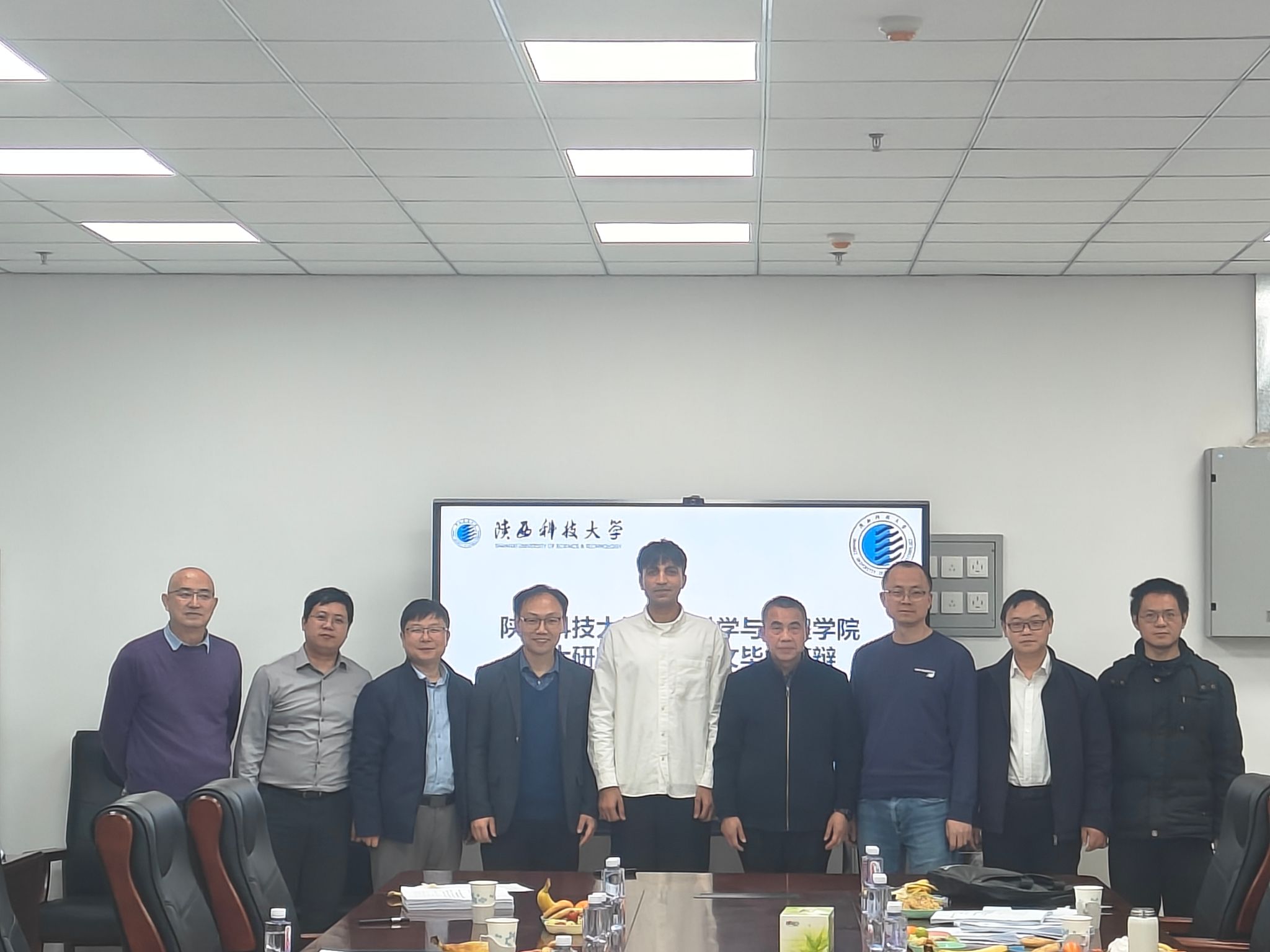 王傳義教授(右四)與留學生阿迪(左五)在環(huán)境學院畢業(yè)答辯現(xiàn)場