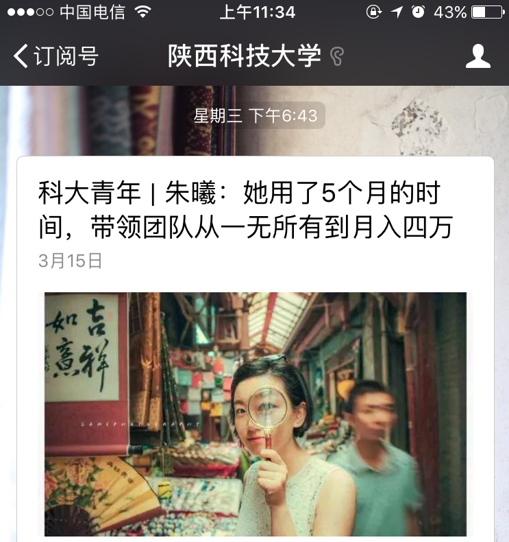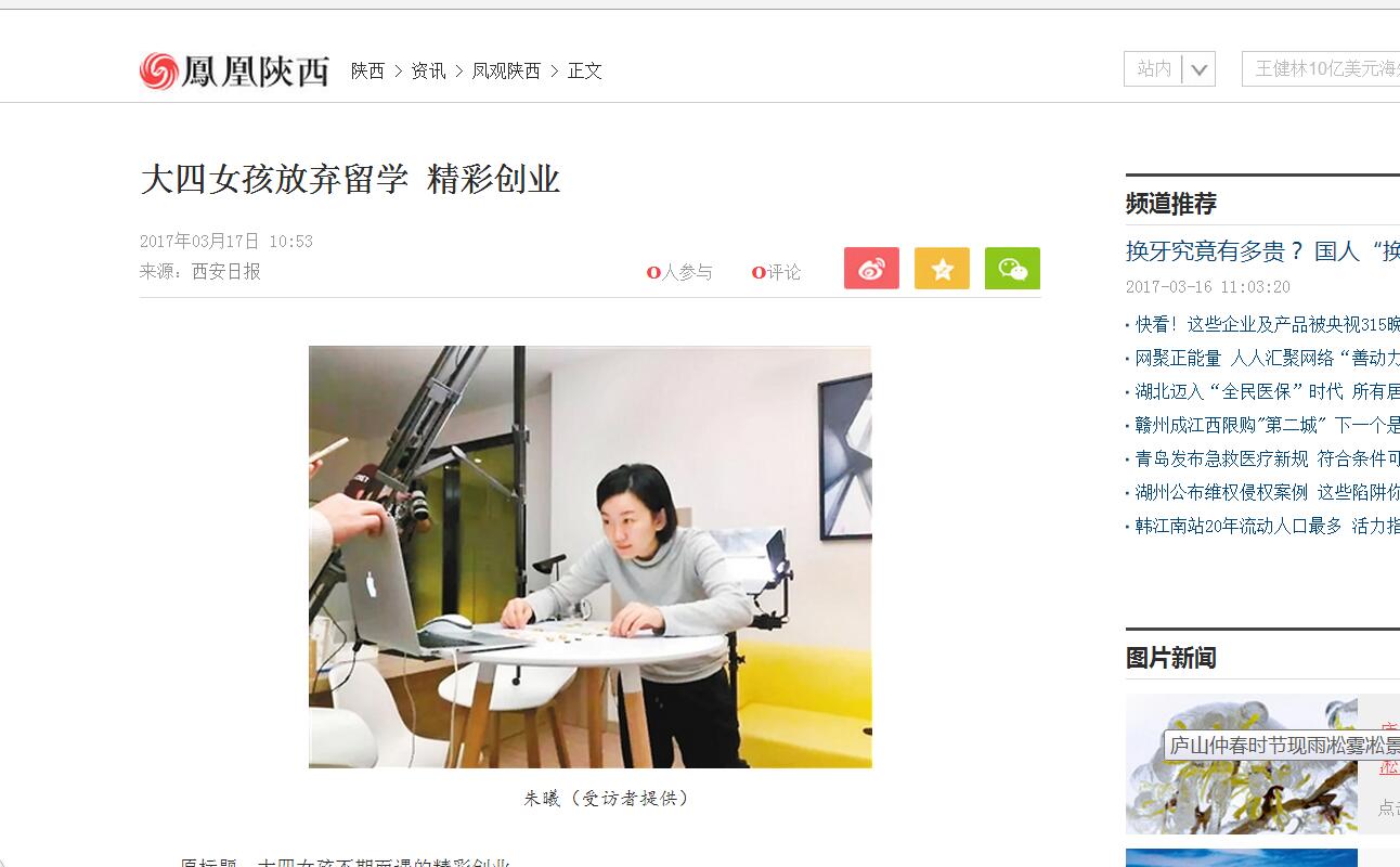 3月15日,一篇《科大青年 | 朱曦:她用了5個月的時間,帶領(lǐng)團(tuán)隊從一無所有到月入四萬》的深度報道在我校官微發(fā)出后,迅速引起了眾多媒體的關(guān)注。朱曦,這位我校大四女孩的精彩創(chuàng)業(yè)故事先后被西安日報、網(wǎng)易、鳳凰網(wǎng)等報道或轉(zhuǎn)載,陜西省教育廳微博也推送了一條關(guān)于朱曦創(chuàng)業(yè)團(tuán)隊的“從0開始,向1邁進(jìn)”的微博。