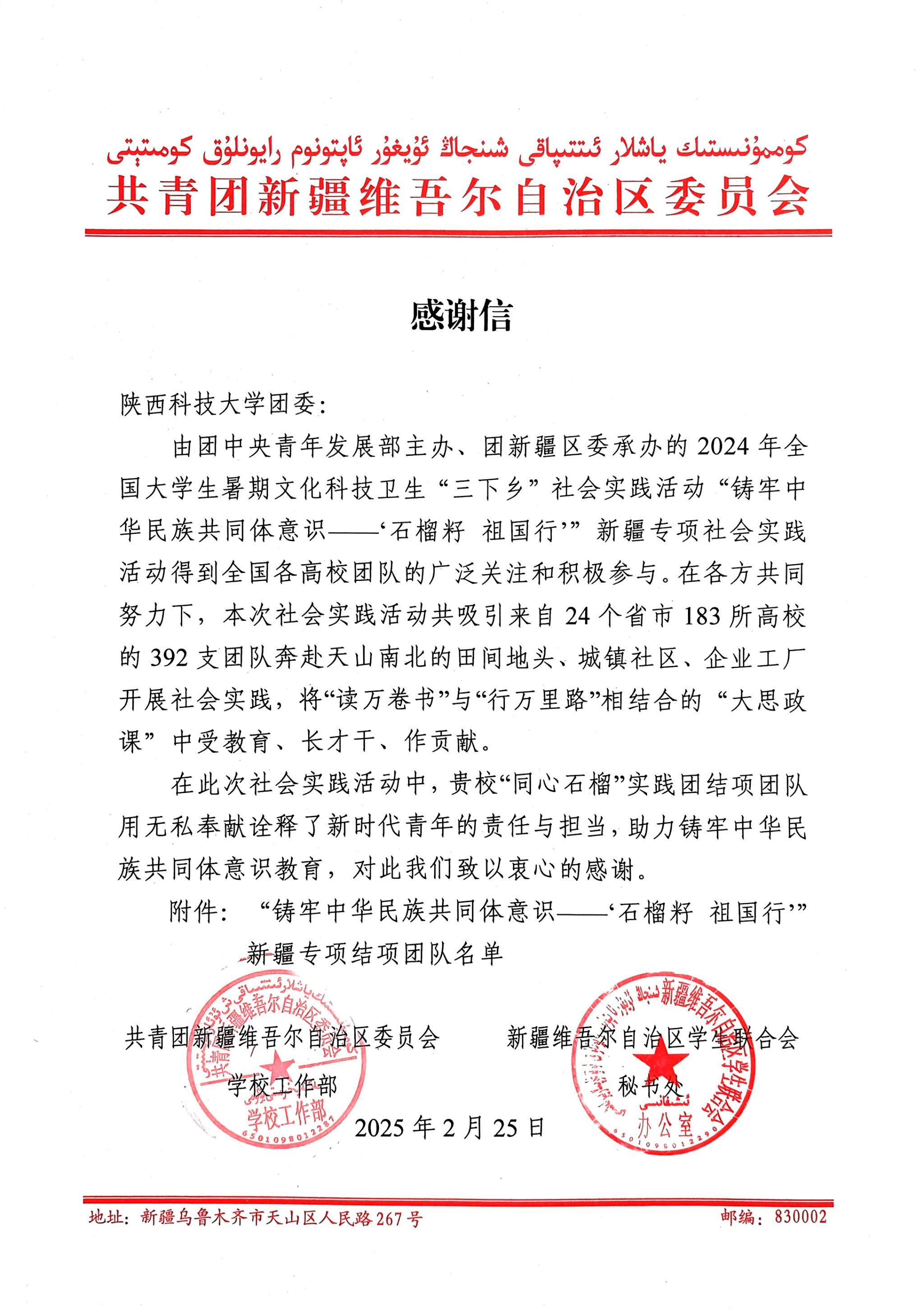 近日,共青團(tuán)新疆維吾爾自治區(qū)委員會(huì)向我校發(fā)來感謝信,對(duì)我校經(jīng)管學(xué)院“同心?石榴”實(shí)踐團(tuán)在“鑄牢中華民族共同體意識(shí)——‘石榴籽 祖國(guó)行’”新疆專項(xiàng)社會(huì)實(shí)踐活動(dòng)中的突出表現(xiàn)予以表揚(yáng)和感謝。