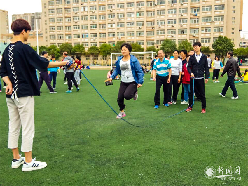 10:20,教工青年組男女跳大繩也如火如荼進(jìn)行著。老師們一個(gè)接一個(gè)跳入,動(dòng)作輕盈。繩子"啪啪"落下,繩搖得越來越快,老師們也跳得越來越起勁,周圍同學(xué)的呼聲也越來越熱烈。