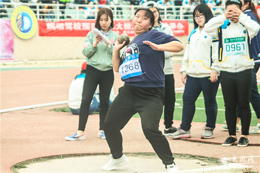 另一邊,大學(xué)生女子組鉛球比賽也正熱火朝天舉行著。細(xì)雨綿綿,選手們拋擲鉛球的手卻絕不綿軟。鉛球高高飛起,落定在碧綠的賽場(chǎng),掌聲與歡呼聲不絕于耳。最終,鎬京學(xué)院張選榮獲得第一。