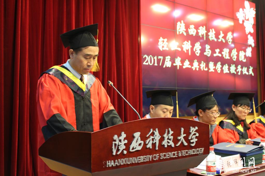典禮開始前,到場師生共同欣賞了由畢業(yè)生自發(fā)拍攝的一段視頻,整個(gè)視頻凝結(jié)了學(xué)生在科大學(xué)習(xí)、生活的點(diǎn)點(diǎn)滴滴,記錄了畢業(yè)生對母校、對學(xué)院、對老師的感恩與祝福。視頻播放結(jié)束,主持人宣布畢業(yè)典禮開始,全體起立,奏國歌,整個(gè)會場莊嚴(yán)肅穆。緊接著,張輝宣讀了《輕工科學(xué)與工程學(xué)院關(guān)于授予2017年(夏季)研究生博士學(xué)位的決定》等三個(gè)文件。接著,輕工學(xué)院副院長張素風(fēng)宣讀《關(guān)于表彰輕工科學(xué)與工程學(xué)院2017屆優(yōu)秀畢業(yè)生、優(yōu)秀學(xué)生干部獲得者的決定》。
