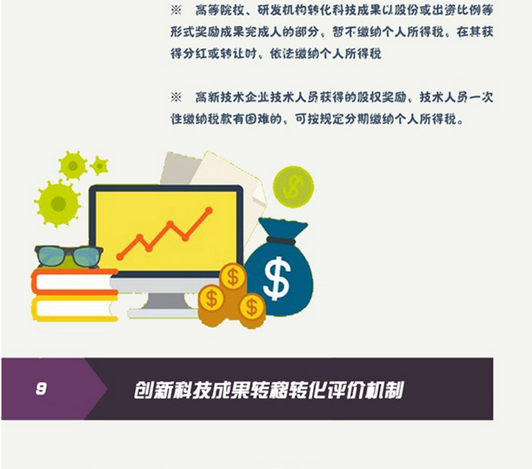 八、加大科技成果轉(zhuǎn)移轉(zhuǎn)化財稅支持力度。高等院校、研發(fā)機構(gòu)轉(zhuǎn)化科技成果以股份或出資比例等形式獎勵成果完成人的部分,暫不繳納個人所得稅,在其獲得分紅或轉(zhuǎn)讓時,依法繳納個人所得稅;高新技術(shù)企業(yè)技術(shù)人員獲得的股權(quán)獎勵,技術(shù)人員一次性繳納稅款有困難的,可按規(guī)定分期繳納個人所得稅。
