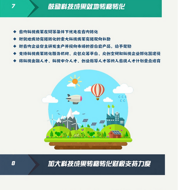 七、鼓勵科技成果就地轉(zhuǎn)移轉(zhuǎn)化。省內(nèi)科技成果在同等條件下優(yōu)先在省內(nèi)轉(zhuǎn)化 。對就地成功實施轉(zhuǎn)化的重大科技成果實施雙向補助,根據(jù)產(chǎn)業(yè)化規(guī)模和納稅總額,給予成果供給方和吸納方 總額合計30%、最高不超過150萬元的后補助或貸款貼息。對省內(nèi)企業(yè)自主研發(fā)生產(chǎn)并投向市場的首臺套產(chǎn)品,按首臺套產(chǎn)品銷售價格的5%給予獎勵,最高不超過50萬元。支持科技成果轉(zhuǎn)化服務(wù)機構(gòu)、眾包眾籌平臺、眾創(chuàng)空間和科技企業(yè)孵化器建設(shè),根據(jù)其業(yè)績給予獎勵和后補助。將科技金融人才、科技中介人才、創(chuàng)業(yè)指導人才等納入省級人才計劃重點培育。