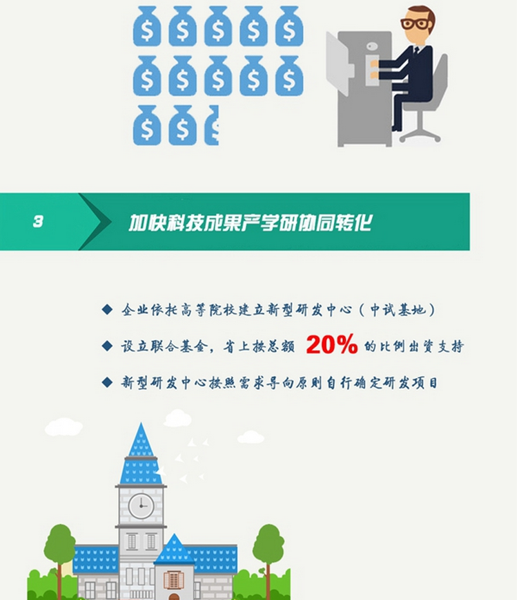 三、加快科技成果產(chǎn)學研協(xié)同轉(zhuǎn)化。支持企業(yè)依托高等院校建立產(chǎn)學研深度融合的新型研發(fā)中心(中試基地),設(shè)立聯(lián)合基金,省上按總額20%的比例出資支持,新型研發(fā)中心(中試基地)按照需求導向原則自行確定研發(fā)項目。對獲得國家科技獎勵的重大成果進行轉(zhuǎn)化的,給予省級科技計劃立項支持 。