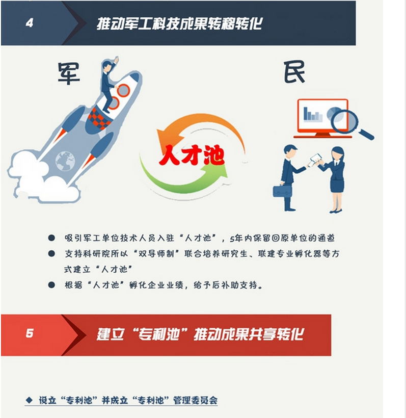 四、推動軍工科技成果轉(zhuǎn)移轉(zhuǎn)化。建立軍民人才雙向流動“人才池”,促進企業(yè)孵化。吸引軍工單位技術(shù)人員入駐“人才池”,5年內(nèi)保留回原單位的通道。支持科研院所特別是涉軍科研院所與地方高等院校以“雙導師制”聯(lián)合培養(yǎng)研究生、聯(lián)建專業(yè)孵化器等方式建立“人才池”。根據(jù)“人才池”孵化企業(yè)業(yè)績,給予后補助支持。