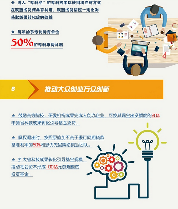 六、推動大眾創(chuàng)業(yè)萬眾創(chuàng)新。鼓勵高等院校、研發(fā)機構(gòu)成果完成人創(chuàng)辦企業(yè),可按其現(xiàn)金出資額度的20%申請省科技成果轉(zhuǎn)化引導基金支持;股權(quán)退出時,按照原值加不高于銀行同期貸款基準利率的50%利息優(yōu)先回購給創(chuàng)業(yè)團隊。擴大省科技成果轉(zhuǎn)化引導基金規(guī)模,撬動社會資本形成100億元總規(guī)模的投資基金。對符合條件的科技型中小企業(yè)貸款給予風險補償,對于創(chuàng)業(yè)投資機構(gòu)投資種子期、初創(chuàng)期科技型企業(yè)發(fā)生的實際投資損失,可按照損失額的一定比例給予風險救助。