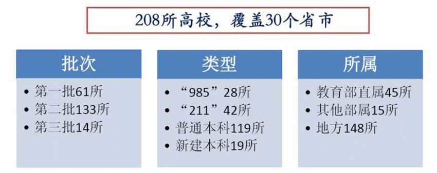 針對(duì)這一現(xiàn)狀,我國(guó)從2008級(jí)大學(xué)生起試點(diǎn)實(shí)施“卓越工程師教育培養(yǎng)計(jì)劃”,2010年起正式實(shí)施。至今,從首批61所試點(diǎn)高校、到第二批133所、再到第三批14所,已覆蓋30個(gè)省份208所高校。其中,985院校28所、211院校42所、普通本科院校119所、新建本科院校19所。