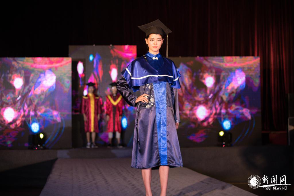 當(dāng)晚,文體館內(nèi)熱鬧非凡,大氣的LED屏,炫目的燈光,時(shí)尚的T臺(tái),模特與設(shè)計(jì)們?yōu)榈綀?chǎng)的觀眾送上了一場(chǎng)視覺(jué)盛宴。作品展演由三個(gè)篇章組成,經(jīng)典學(xué)位服的創(chuàng)意方案展示;中式學(xué)位禮裝的融合與演繹;箱包與鞋靴的創(chuàng)意方案展演。模特走秀總計(jì)展示作品總計(jì)48個(gè)系列,240套成衣、30套鞋帽及箱包。炫目的燈光下,伴隨著節(jié)奏感十足的音樂(lè),模特們充分展示了設(shè)計(jì)師對(duì)新時(shí)代學(xué)位服的理解和創(chuàng)意。當(dāng)晚的走秀和點(diǎn)評(píng)持續(xù)了2個(gè)小時(shí),服設(shè)畢業(yè)生們用實(shí)實(shí)在在的原創(chuàng)設(shè)計(jì)方案為盛夏的科大校園刮起了一股“時(shí)尚旋風(fēng)”。
