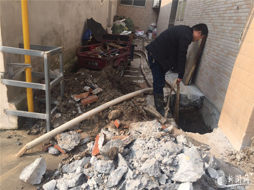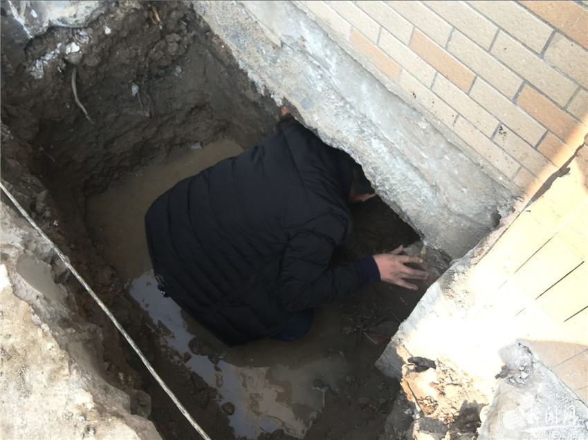 學(xué)生區(qū)六公寓門前人行道開挖后工人維修暖氣管道