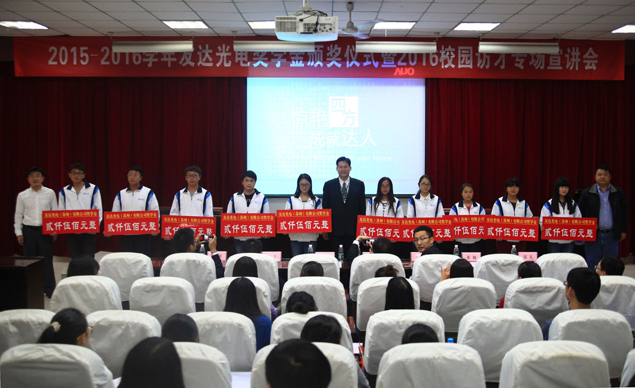 近日,2015-2016學(xué)年友達(dá)光電獎(jiǎng)學(xué)金頒獎(jiǎng)儀式暨2016校園訪才專場(chǎng)宣講會(huì)在我校三號(hào)教學(xué)樓101報(bào)告廳舉行。友達(dá)光電(蘇州)有限公司總經(jīng)理符春坤一行8人,電氣與信息工程學(xué)院、機(jī)電工程學(xué)院黨委副書記,全體獲獎(jiǎng)學(xué)生和各學(xué)院畢業(yè)生參加了儀式。儀式由電信學(xué)院黨委副書記鄭東主持。