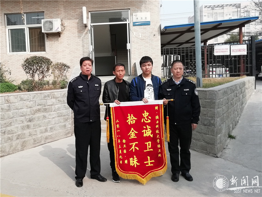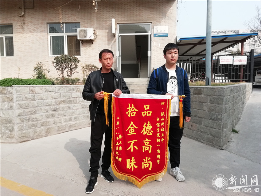 來自陜西榆林的徐衛(wèi)國先生3月12日一大早就趕到陜西科技大學(xué),分別將寫有“拾金不昧,忠誠衛(wèi)士”和“拾金不昧,品德高尚”的兩面錦旗,鄭重地送到學(xué)校保衛(wèi)處、電氣與信息工程學(xué)院大四學(xué)生張一鳴手中,以此表達他深深的謝意。