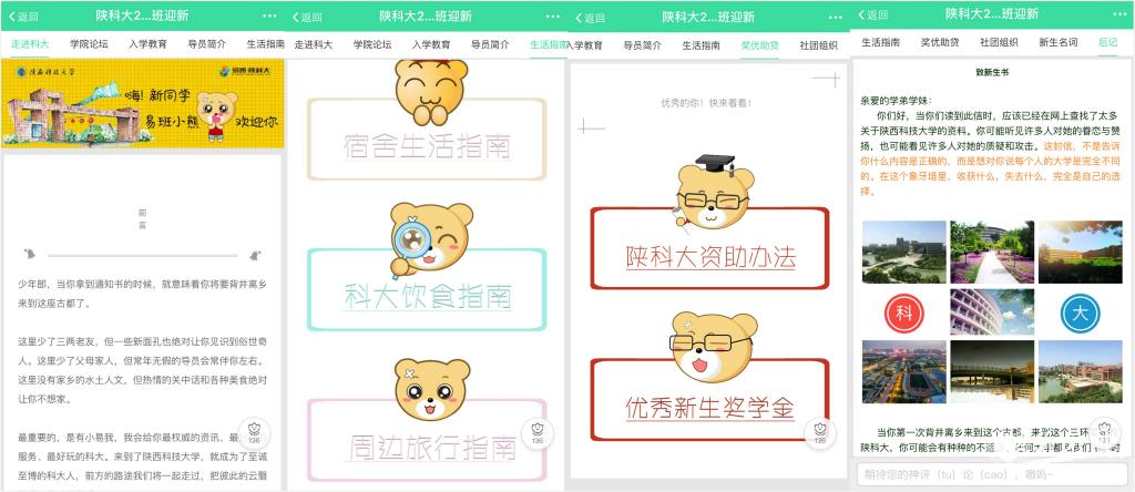 率先嘗試?yán)靡装嗥脚_(tái)將新生入學(xué)教育、管理和服務(wù)工作前置。7月29日,我校2017級(jí)易班迎新系統(tǒng)正式上線,系統(tǒng)涵蓋9大迎新專欄、7大入學(xué)教育主題、50余個(gè)校園生活功能頁(yè)面、100多張“畫(huà)冊(cè)”式校園圖示和3D全景空間校園展示、12個(gè)院(部)新生輔導(dǎo)員公共號(hào)等內(nèi)容,從食、住、行、學(xué)等方面對(duì)新生進(jìn)行了立體形象、圖文并茂的全方位宣傳推介和教育。易班迎新系統(tǒng)的上線既給新生營(yíng)造了美麗校園、美好大學(xué)時(shí)光的“初印象”,又徹底顛覆了新生來(lái)校報(bào)到、注冊(cè)繳費(fèi)后再聯(lián)系輔導(dǎo)員、熟悉校園環(huán)境的傳統(tǒng)迎新服務(wù)模式。系統(tǒng)開(kāi)通僅三天, 2017級(jí)的3014名新生便已順利完成認(rèn)證報(bào)到,在共享全國(guó)各高校教育信息化成果的同時(shí),開(kāi)始充分體驗(yàn)融生活服務(wù)、文化娛樂(lè)、教育教學(xué)、思想引領(lǐng)為一體的學(xué)校易班平臺(tái)的一站式服務(wù)。